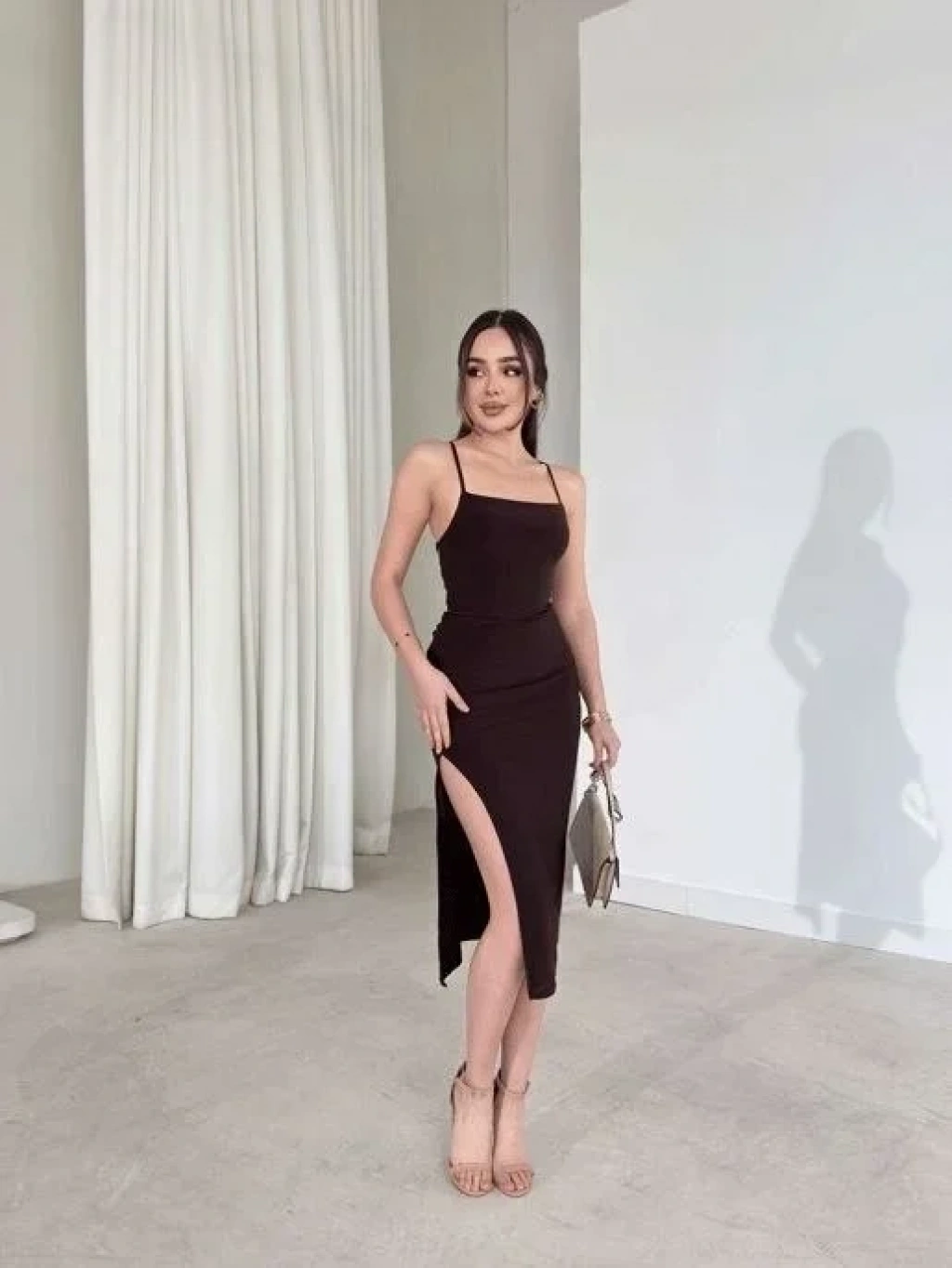 İp Askılı Sırt Dekolteli Bağlama Detaylı Yırtmaçlı Midi Elbise - Kahverengi