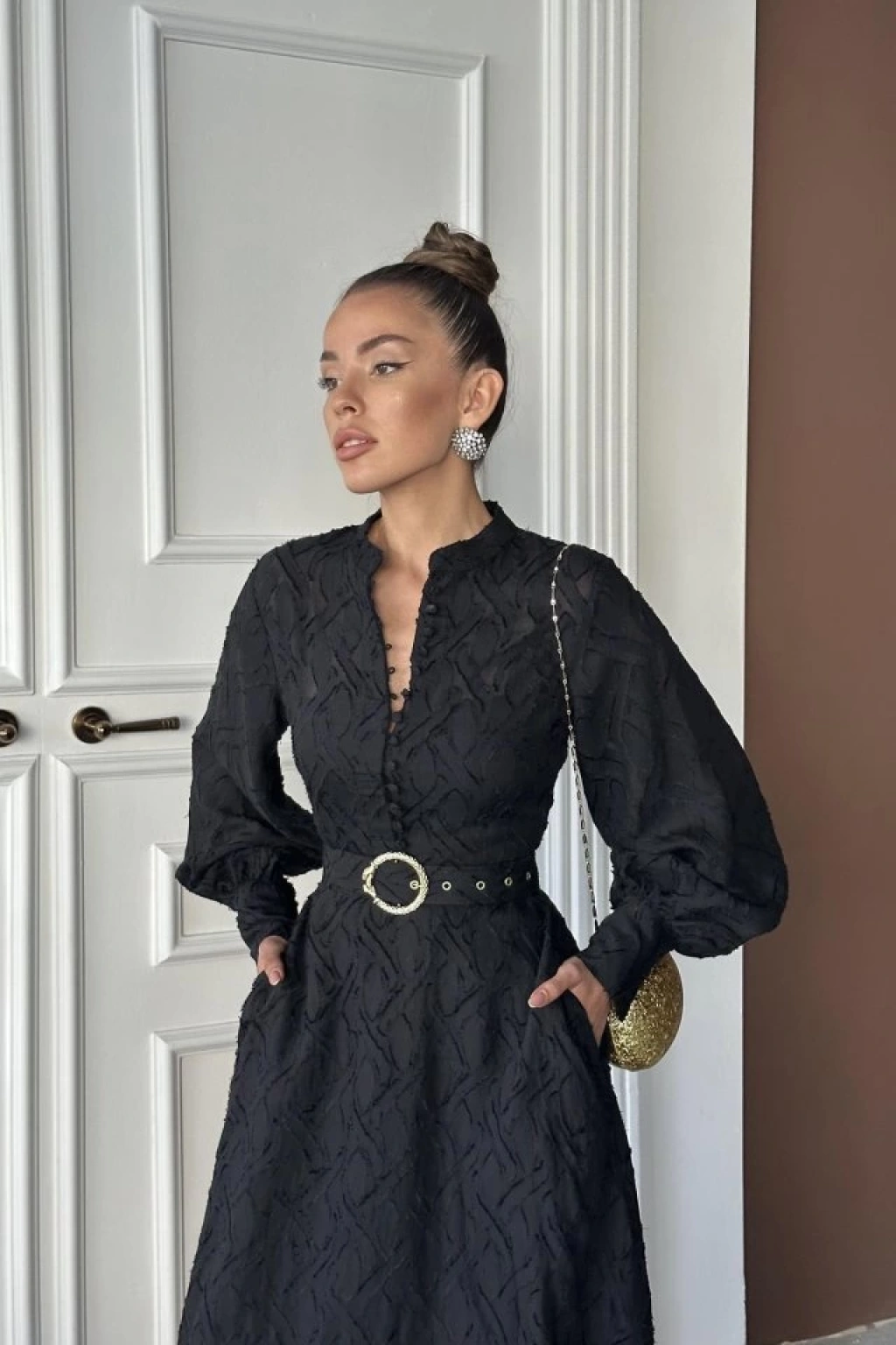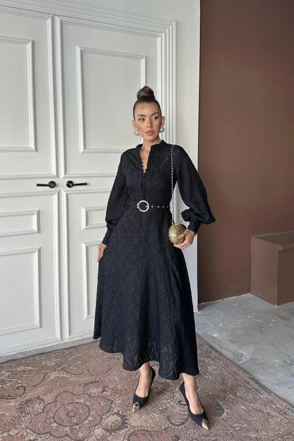 Siyah Kemer Detaylı Uzun Elbise