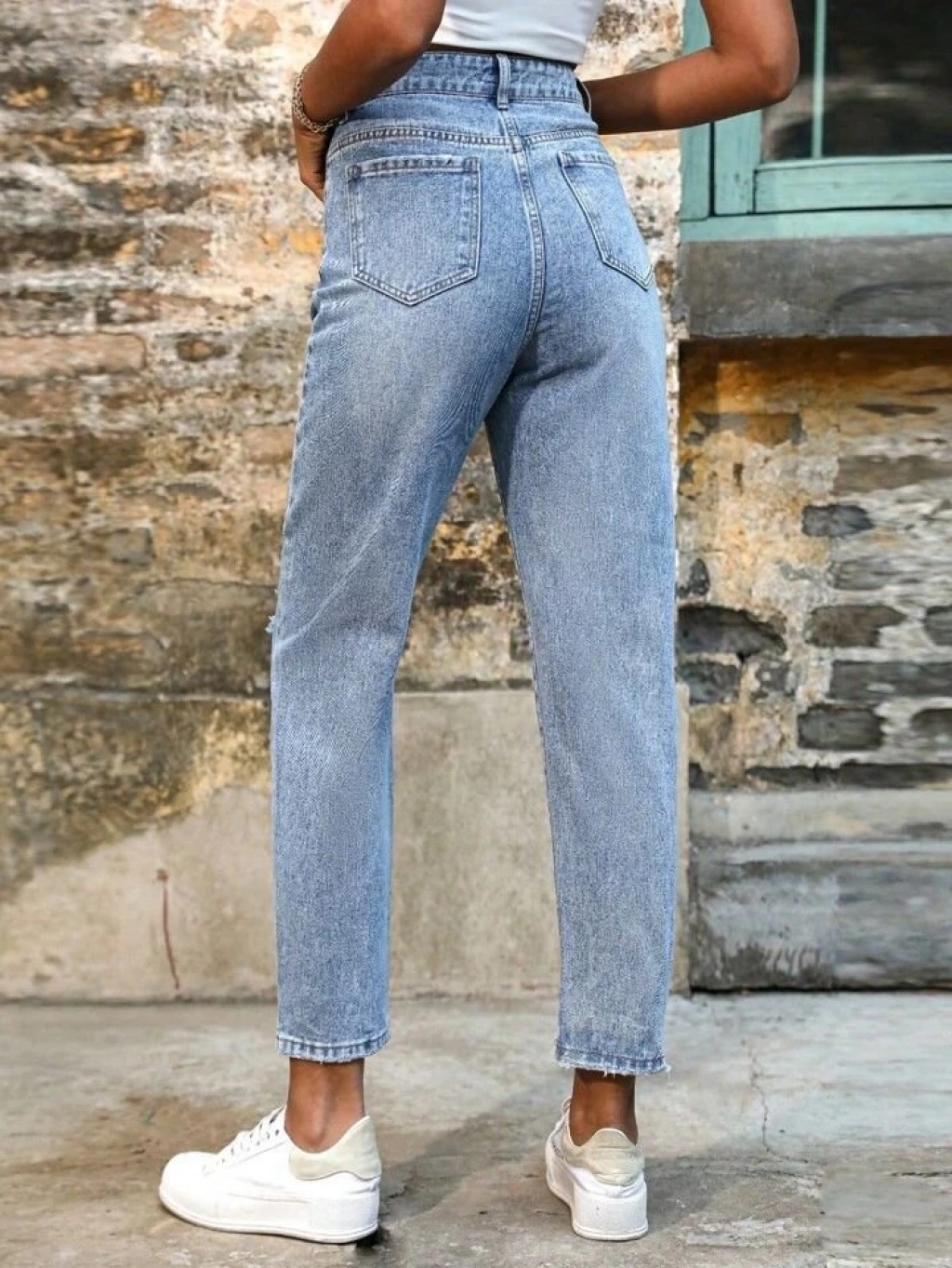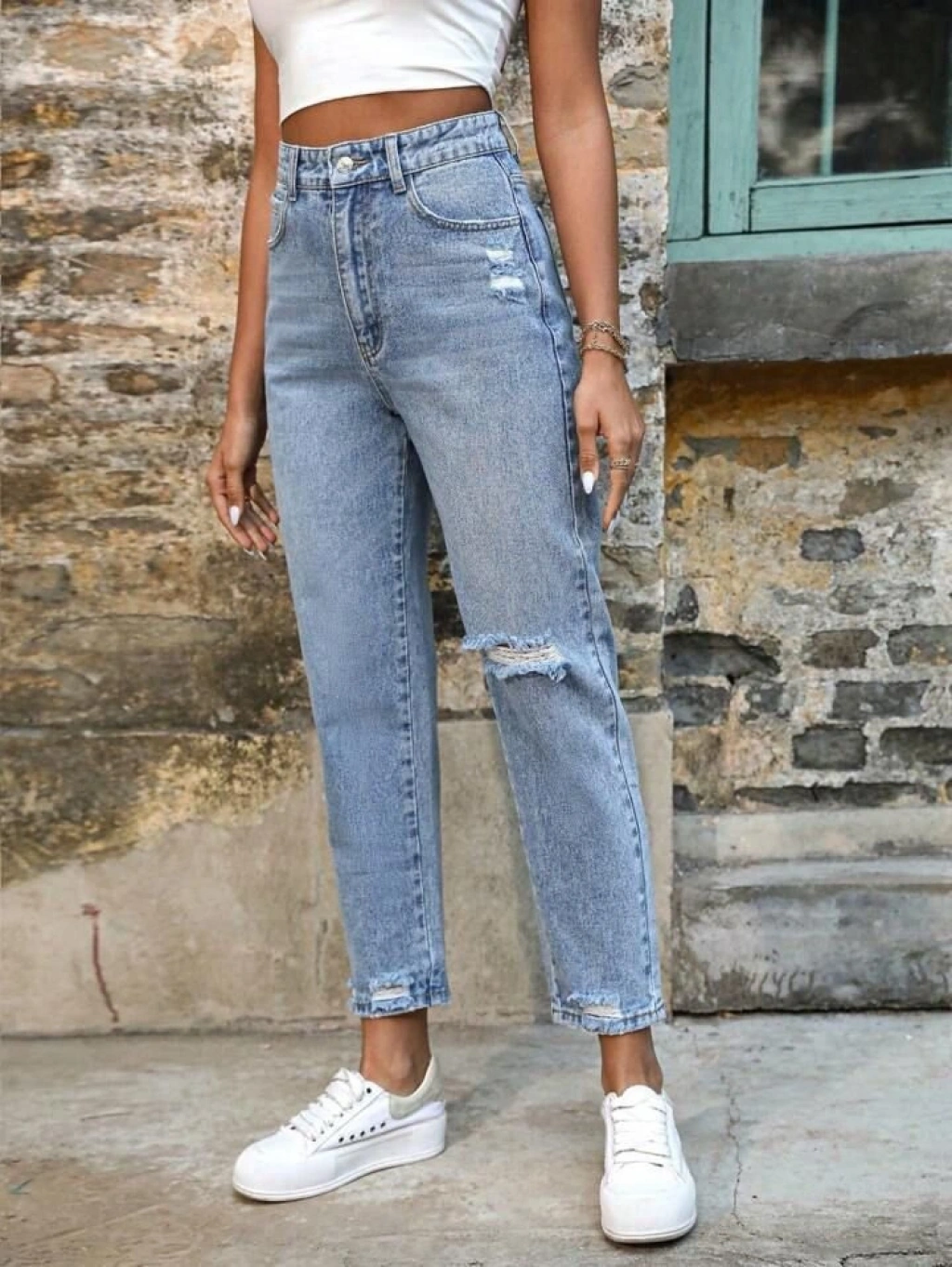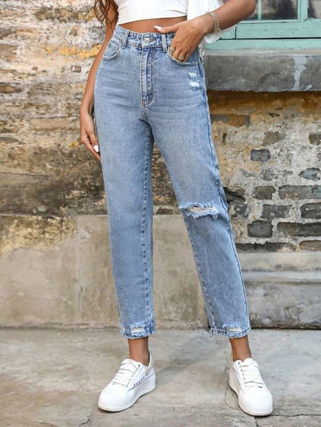 Kadın Açık Mavi Yırtık Mom Fit Kot Pantolon