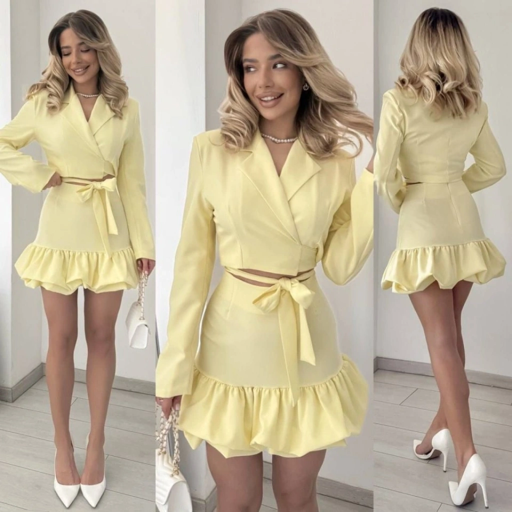 Kadın anşet Yaka Detay Göbek Bağcıklı Ceket Ve Volanlı Etek Takım