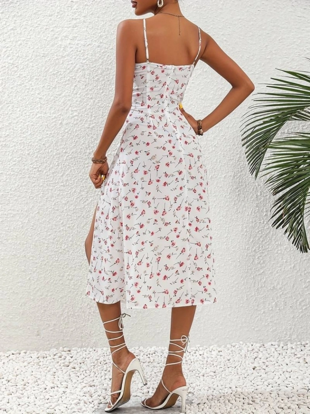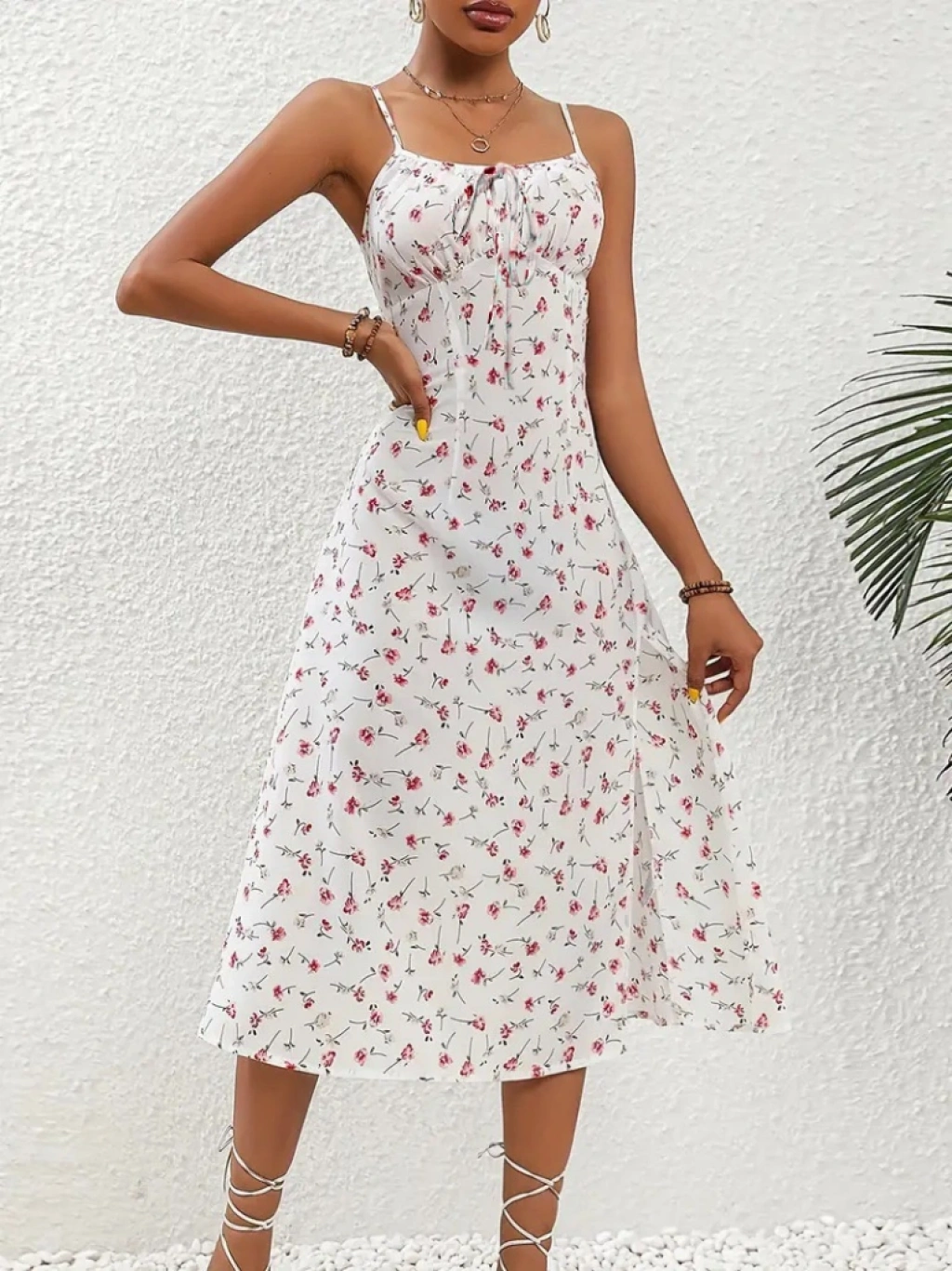 Kadın Askılı çiçek Baskı Göğüs Bağlama Ve Büzgü Detay Yırtmaçlı Midi Boy Süprem Elbise