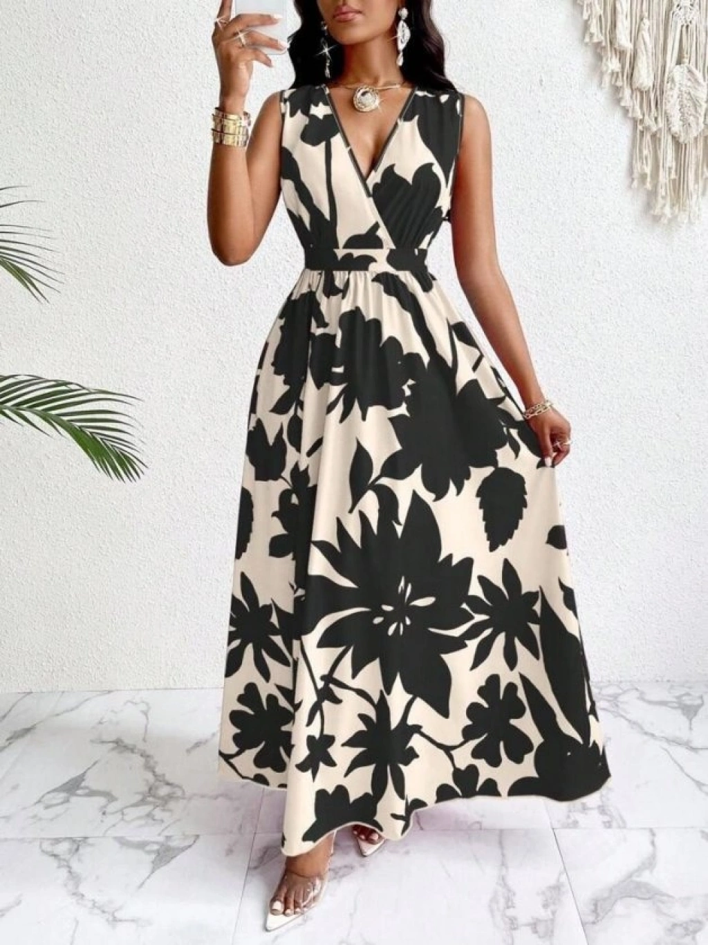 Kadın Askılı Kruvaze Yakalı çiçek Desenli Uzun Süprem Elbise
