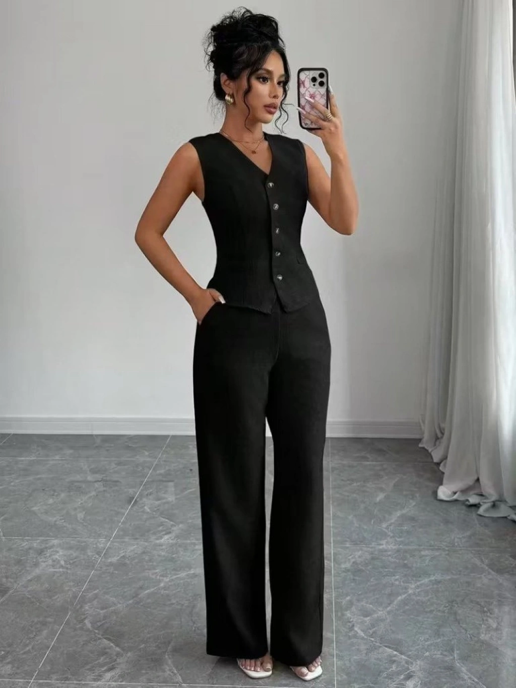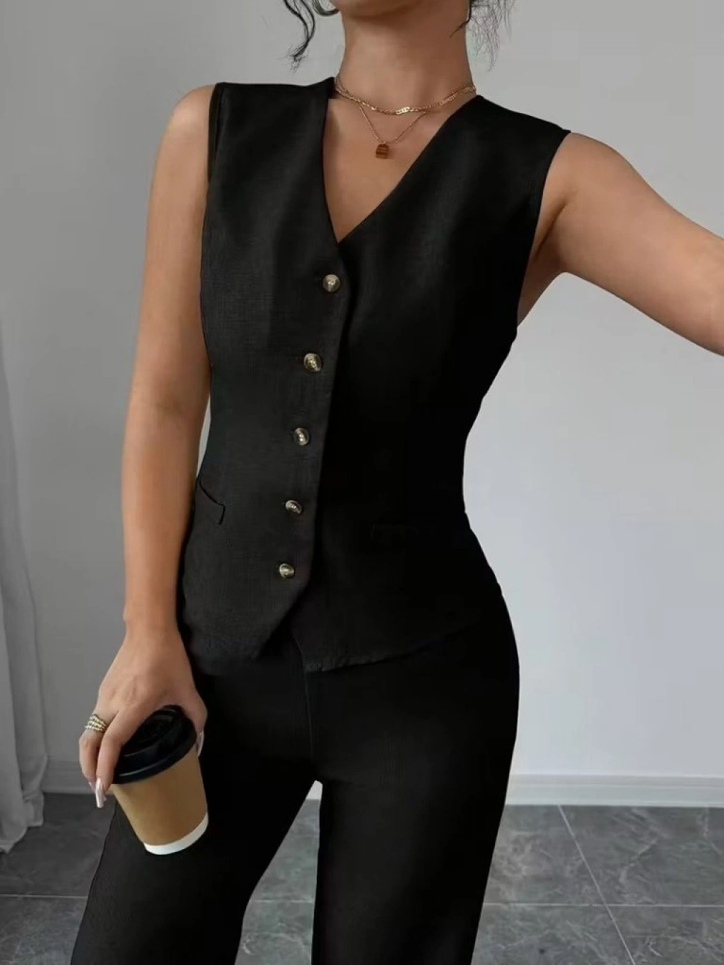 Kadın Askılı önden Düğmeli Bluz Ve Pantolon Keten Ikili Takım