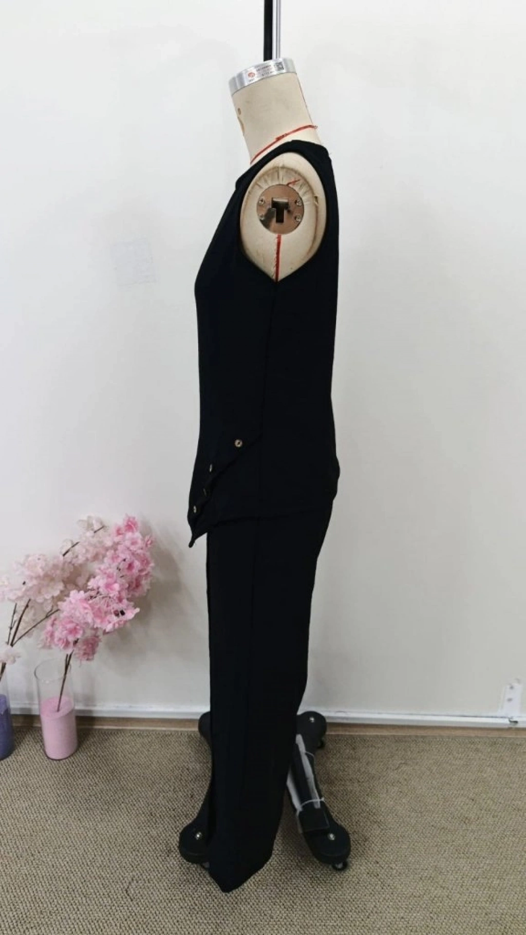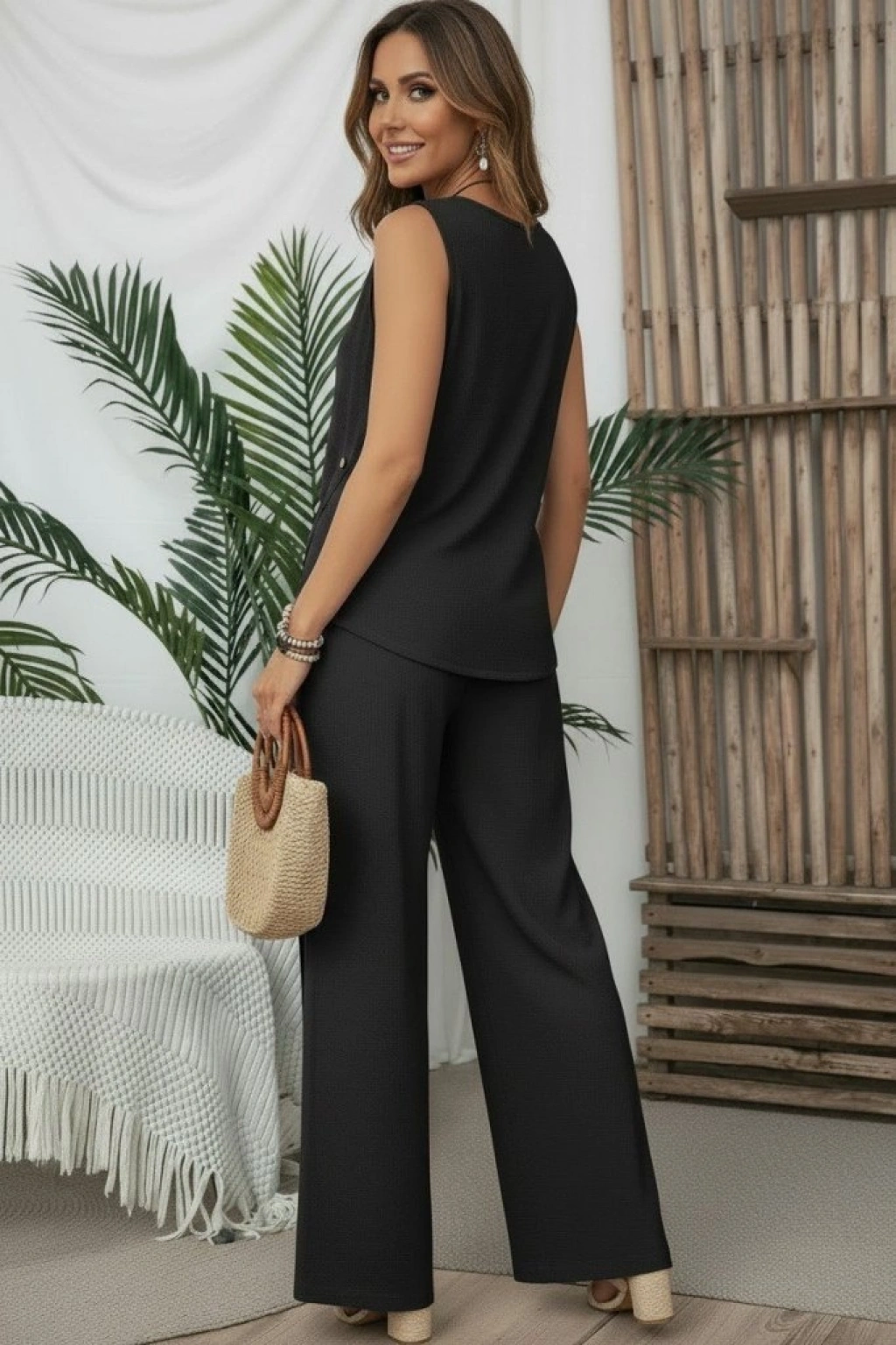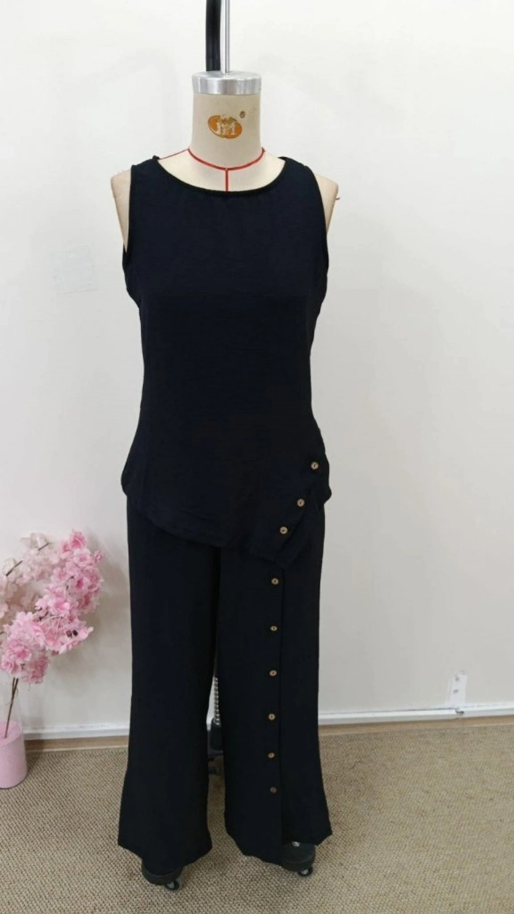 Kadın Askılı Yuvarlak Yakalı önü Asimetrik Detaylı Düğmeli Aerobin Bluz Ve Pantolon Ikili Takım