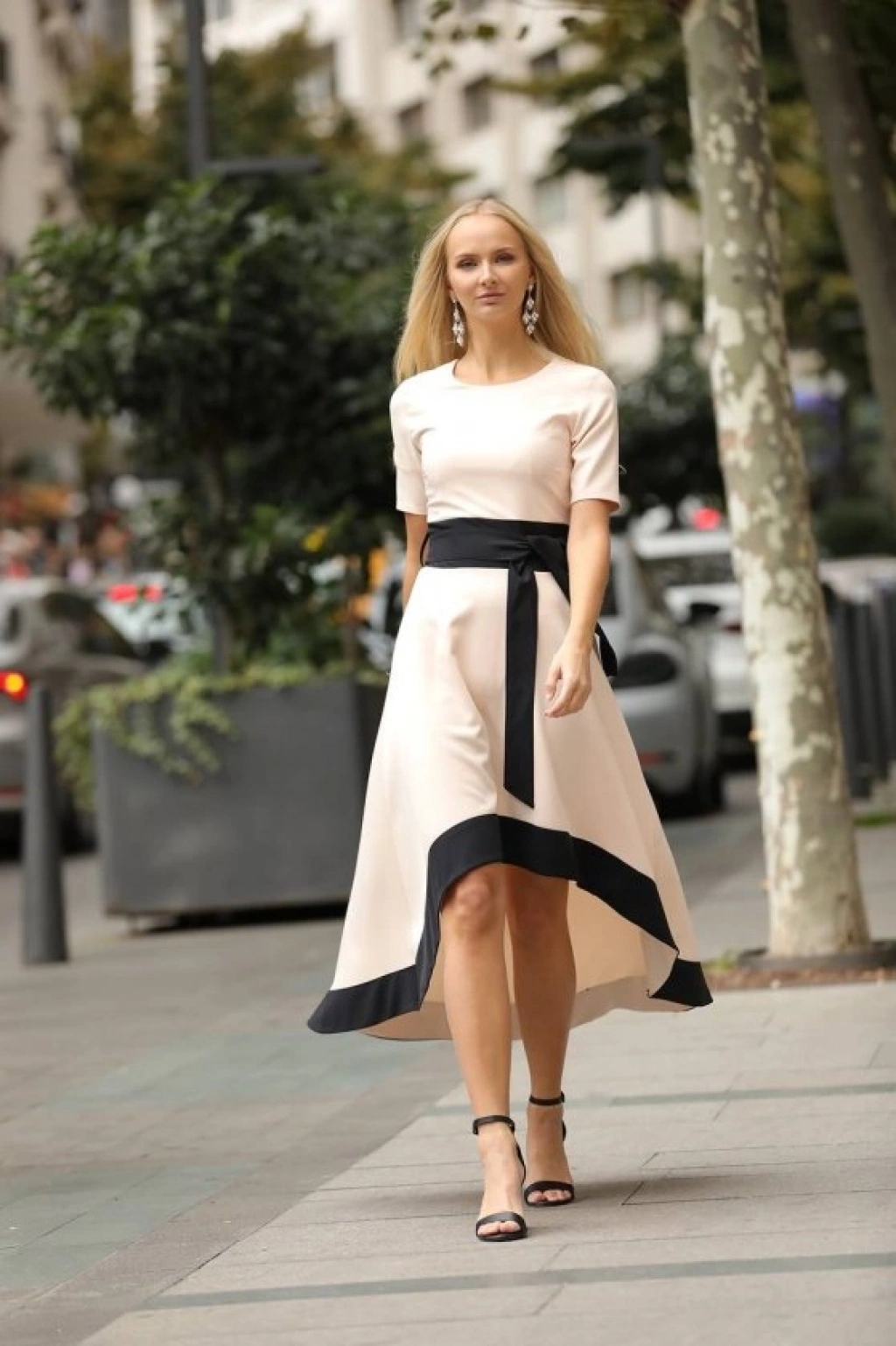 Kadın Atlas Kumaş Bisiklet Yaka Asimetrik Kesim Belde Kuşak Detaylı Elbise