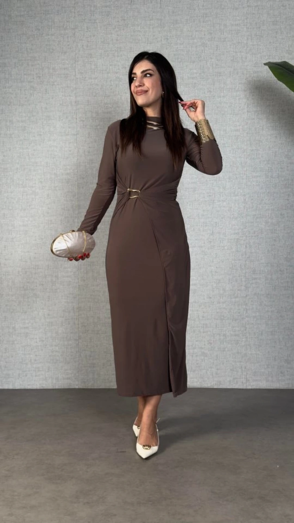 Kadın Balıkçı Yaka Toka Detay Sandy Kumaş Midi Boy Elbise