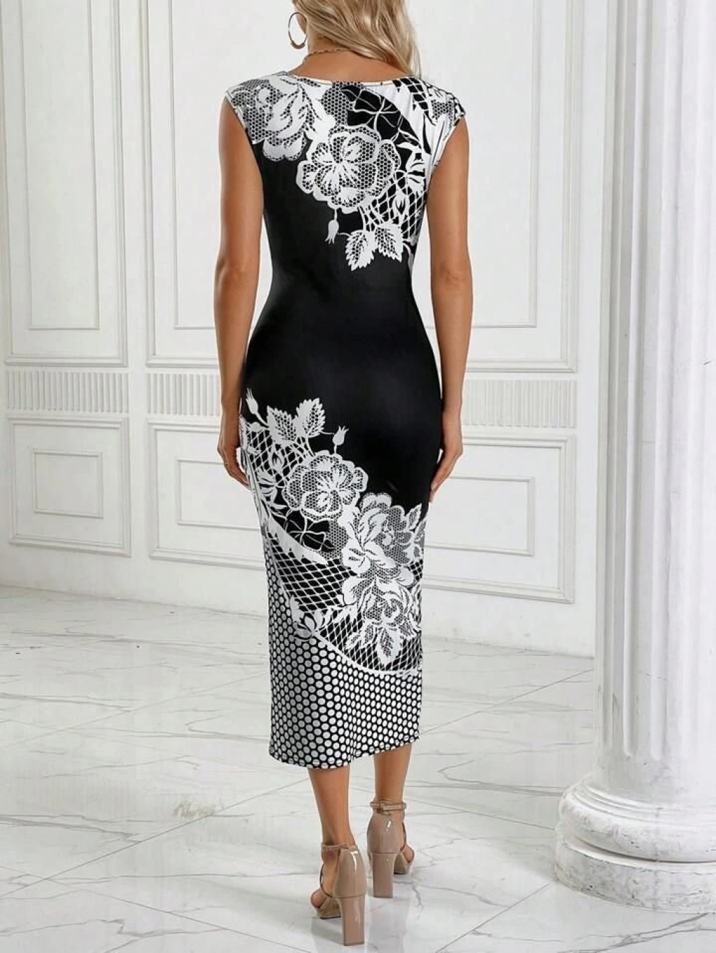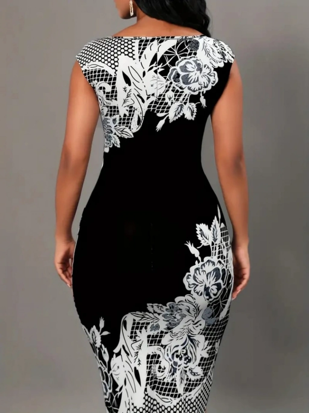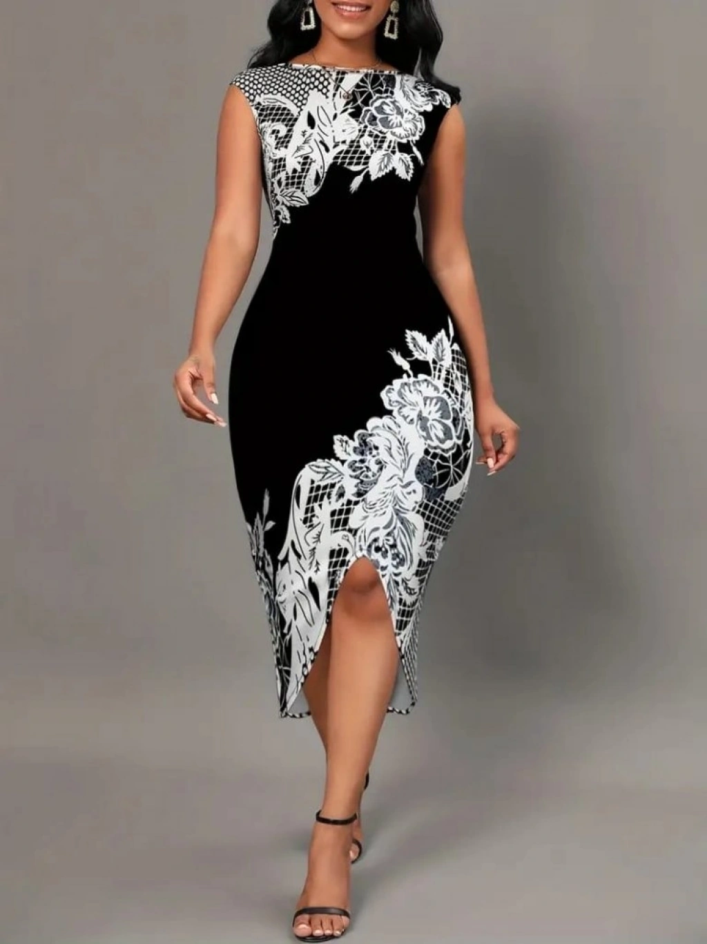 Kadın Beyaz Çiçek Desen Kayık Yaka Yırtmaç Detaylı Dalgıç Elbise