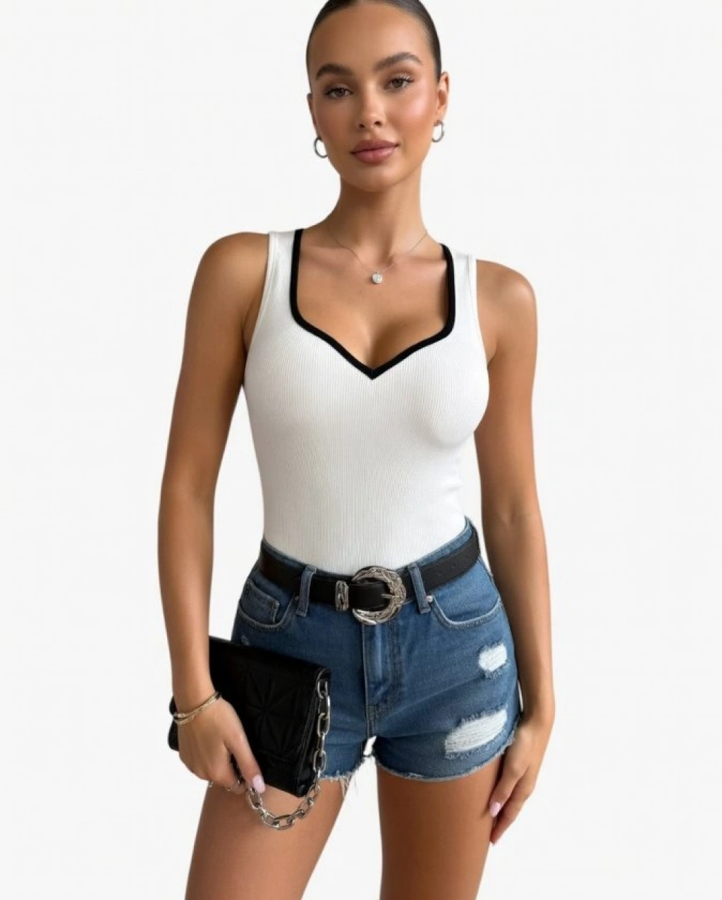 Kadın Beyaz Kalp Yaka Siyah Biyeli Kaşkorse Bluz Atlet