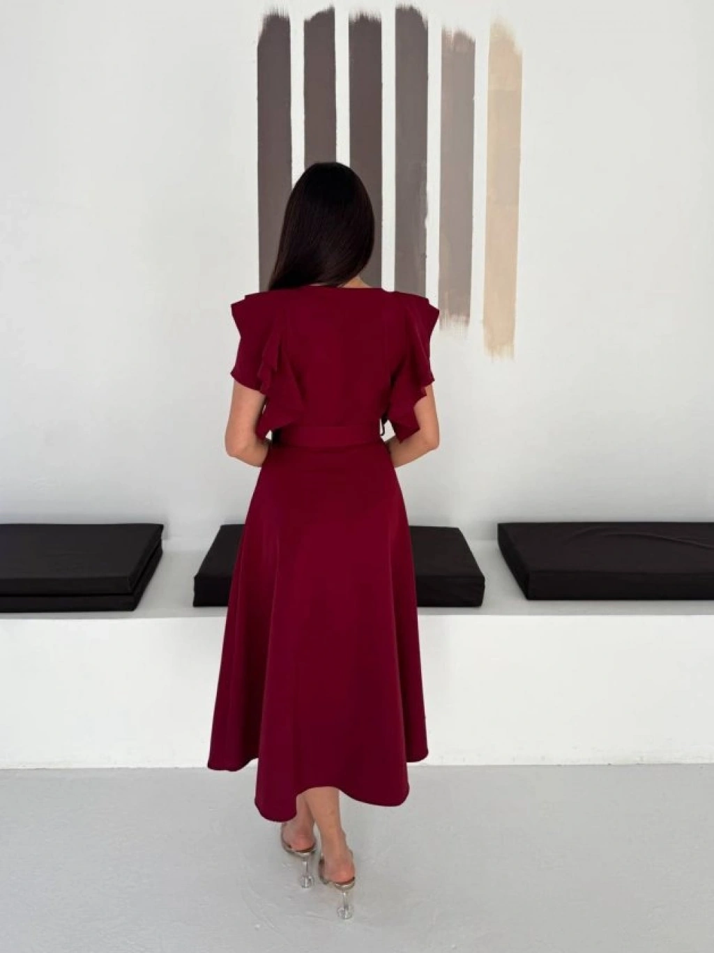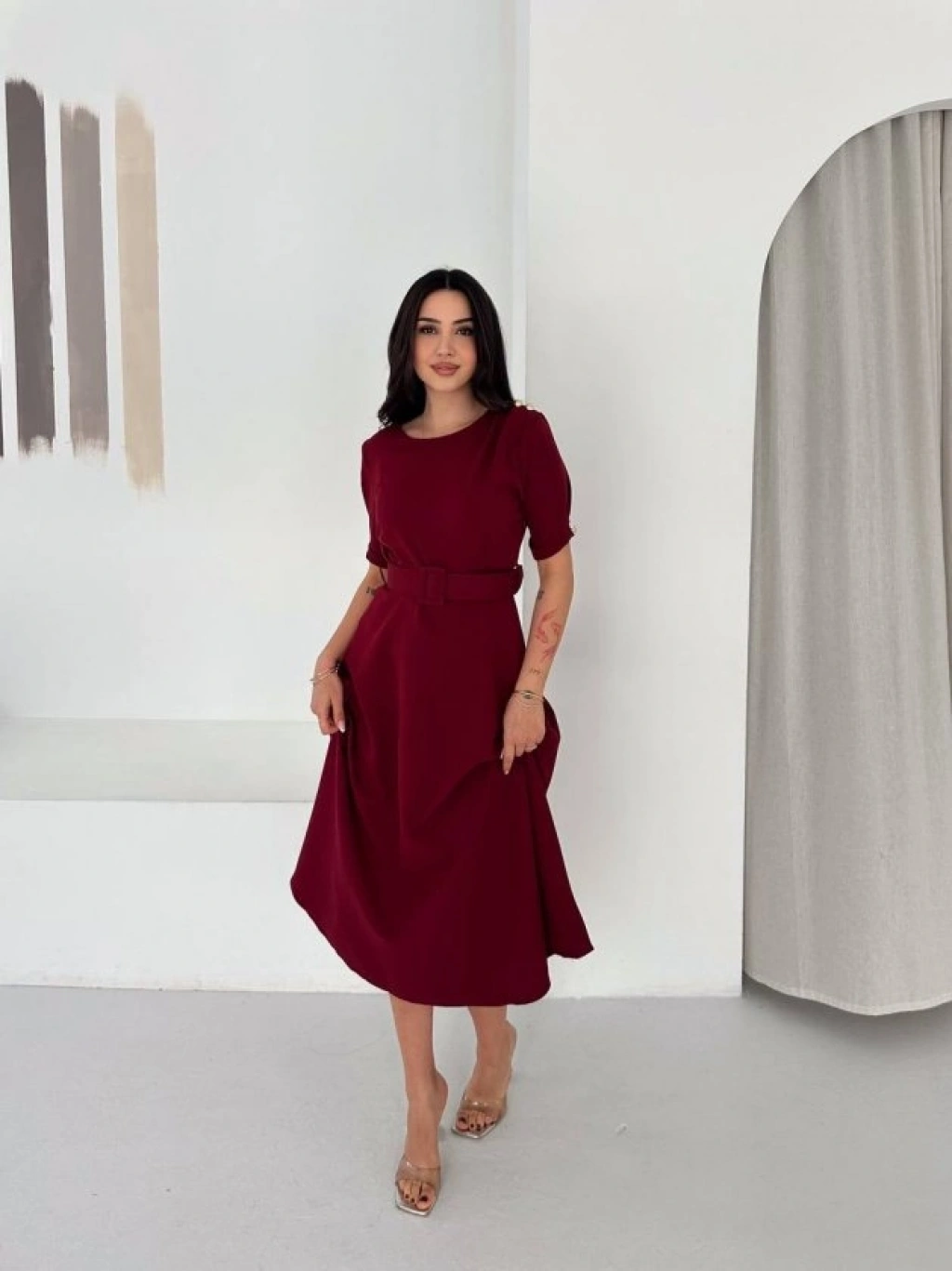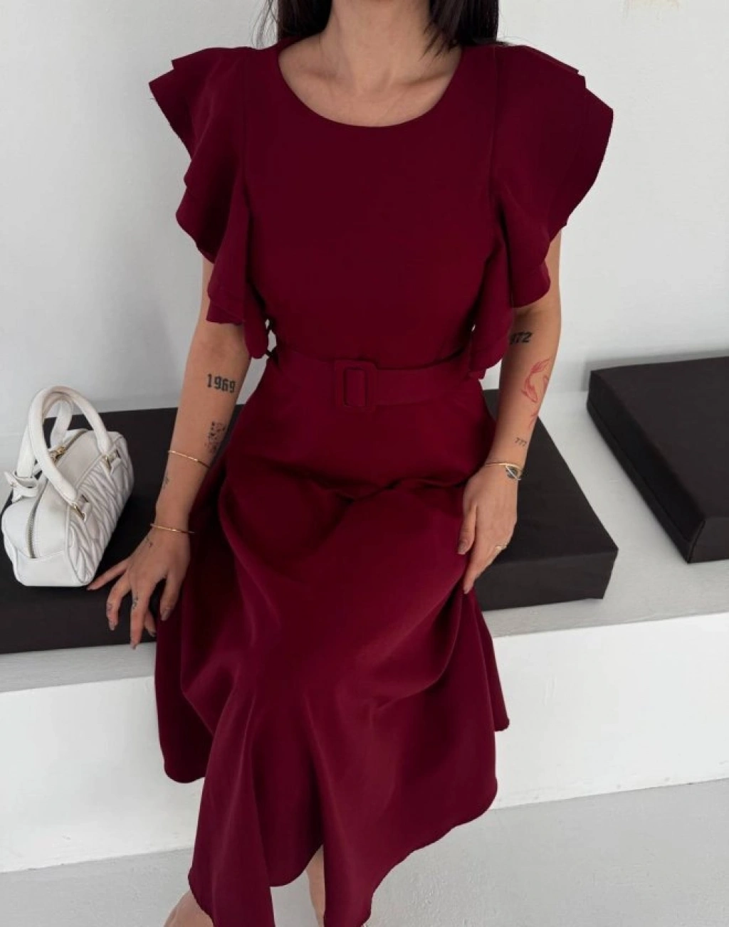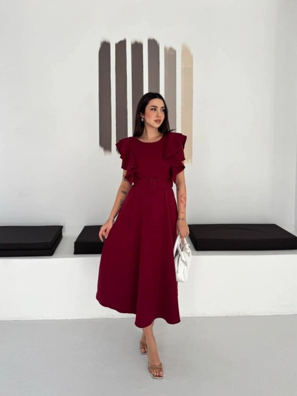 Kadın Bisiklet Yaka Kollar Fırfırlı Kemer Dahil Double Kumaş Midiboy Elbise