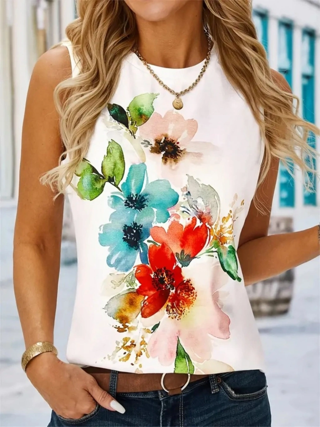 Kadın Bisiklet Yaka Sıfır Kol Renkli çiçek Baskılı Süprem Bluz
