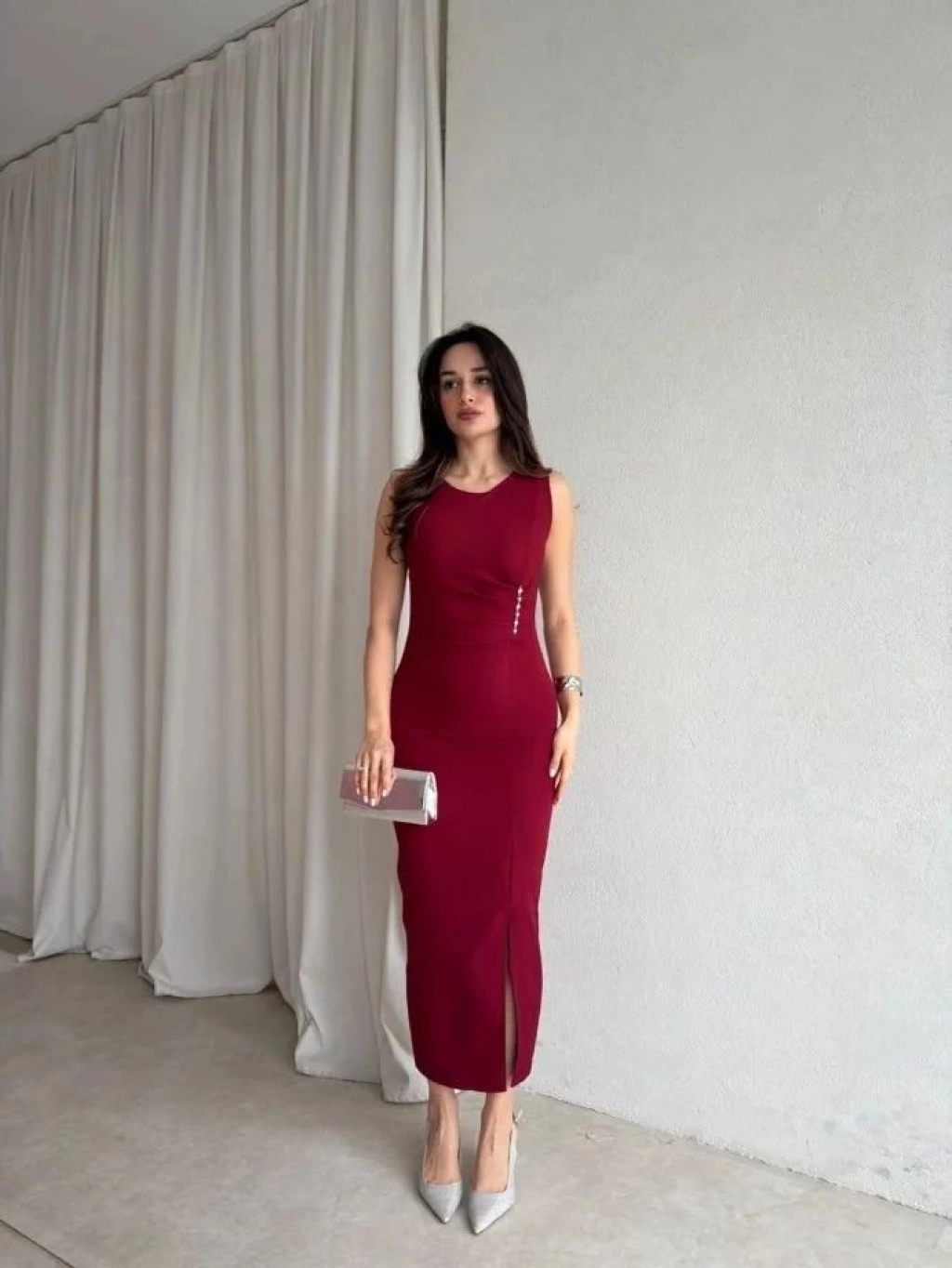 Kadin Bisiklet Yaka Yandanda Kulplu Yirtmac Detay axi Boy Elbise