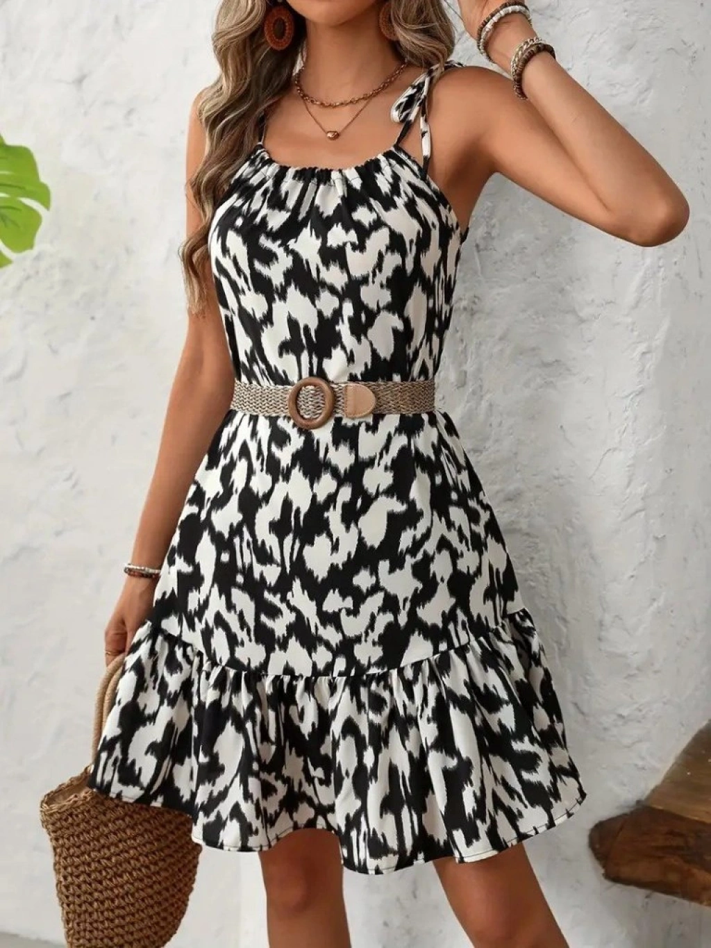 Kadın Boyundan Askılı Desenli Fırfırlı Süprem Elbise