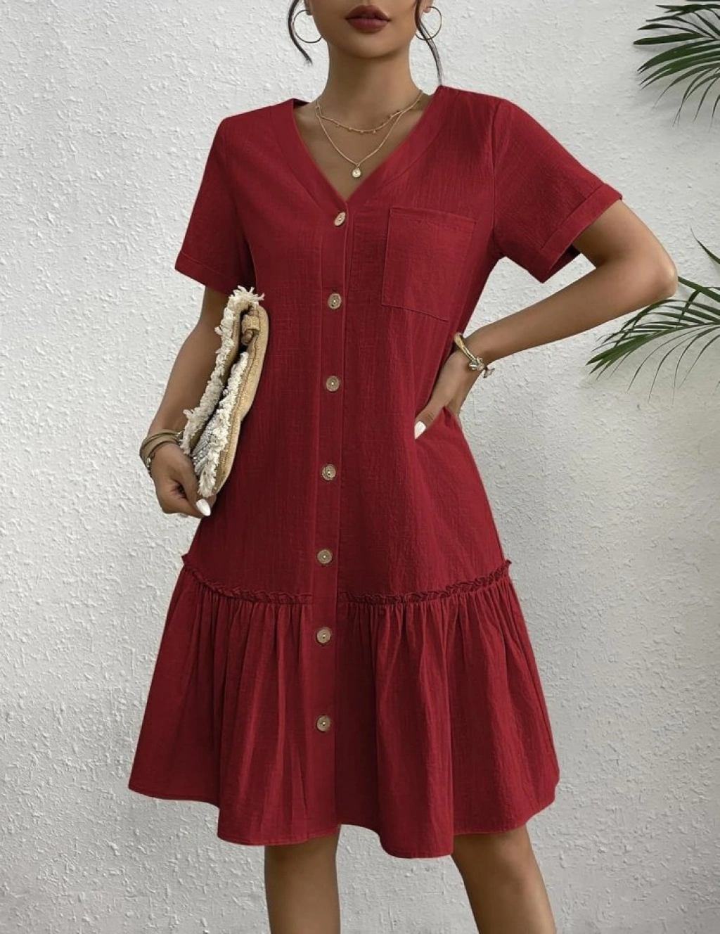 Kadın Cep Detaylı Düğmeli Sofya Keten Kumaş Elbise