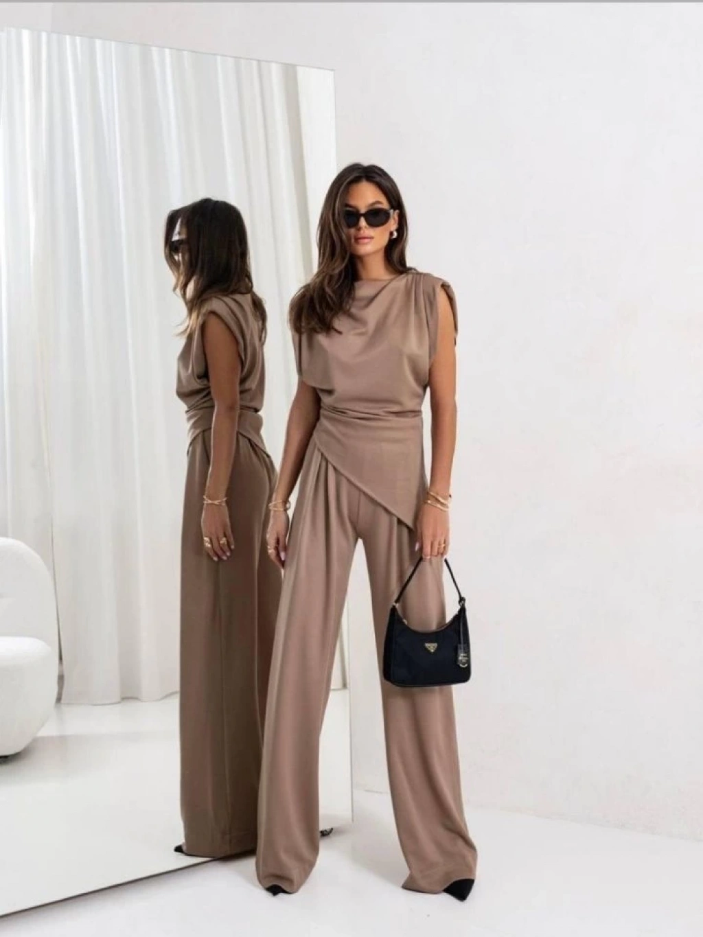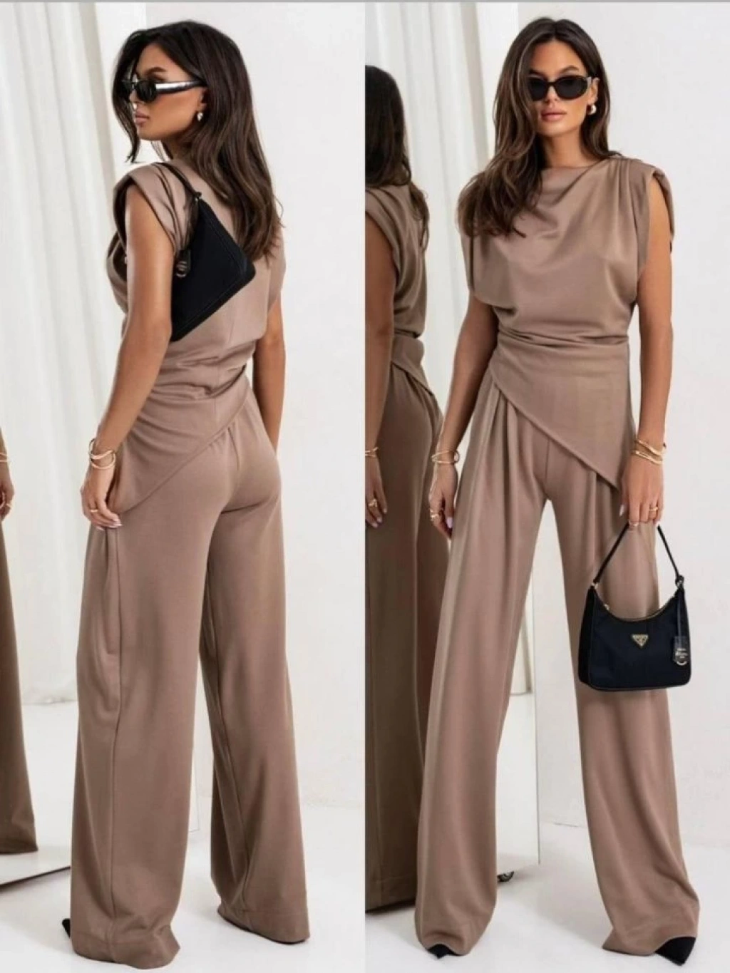 Kadın Dalgıç Kumaş Sıfır Kol Bluz Ve Bol Kesim Pantolon Ikili Takım