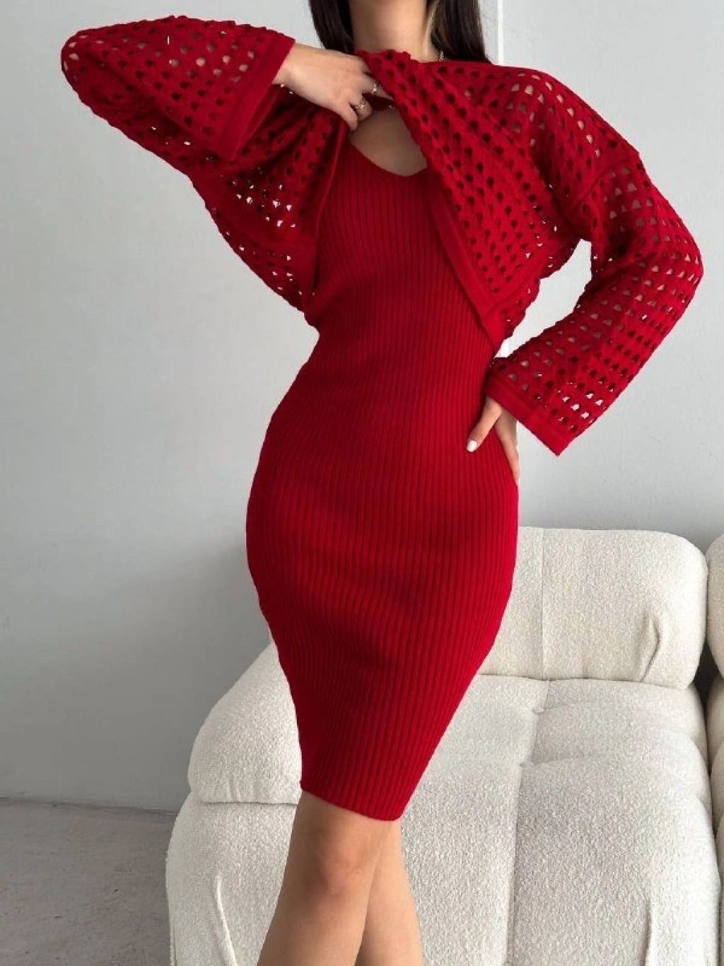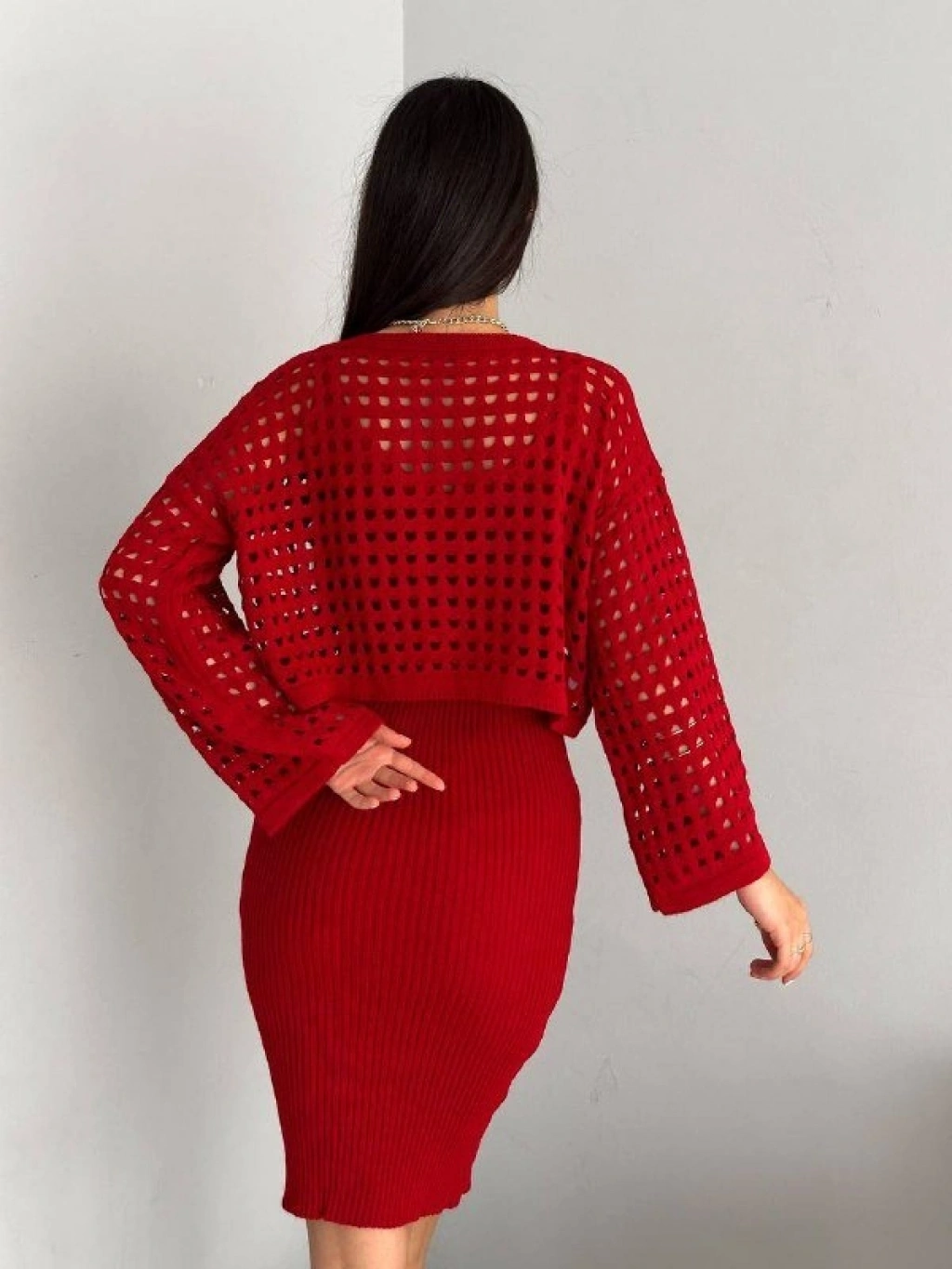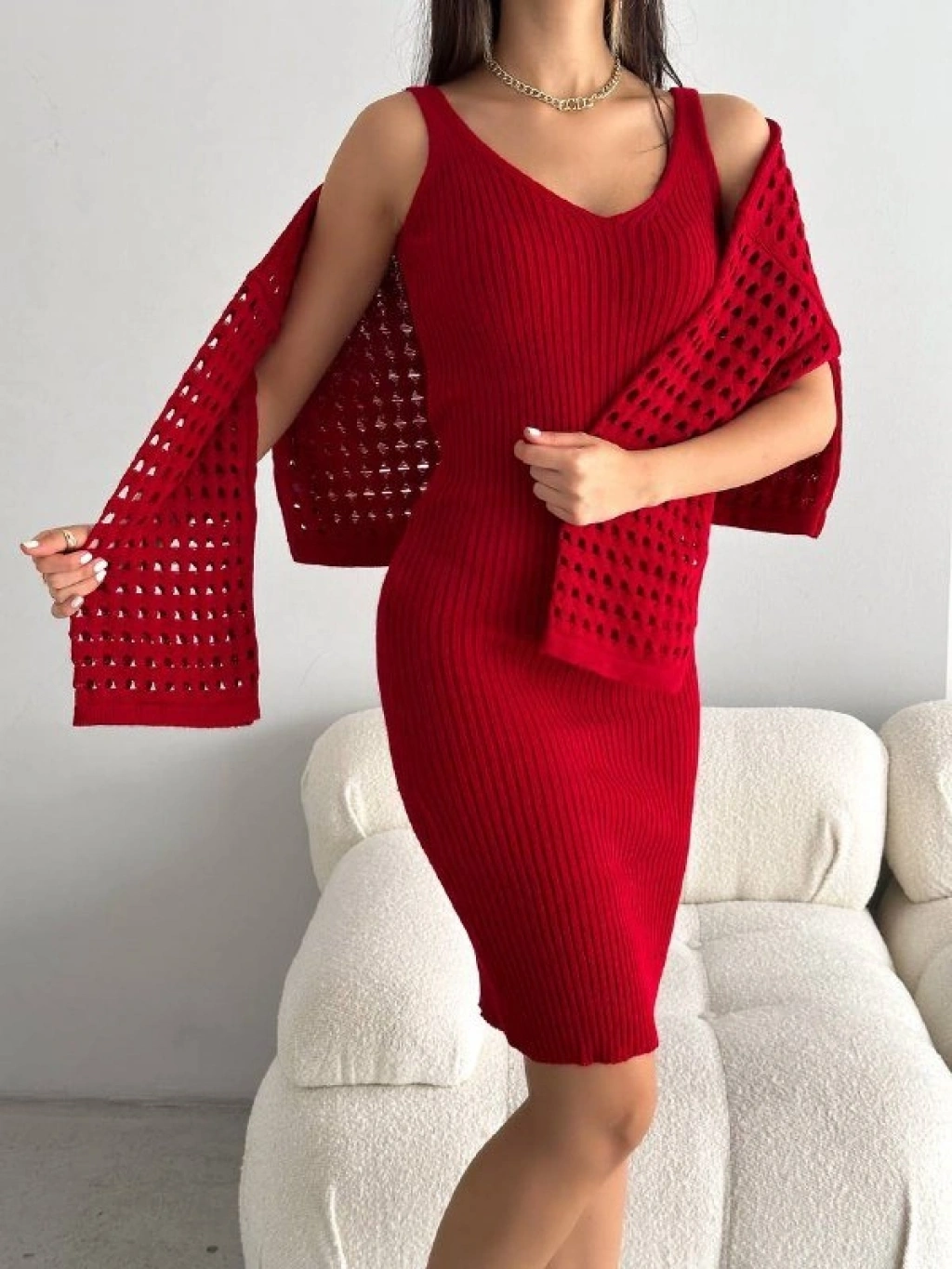 Kadın Delikli Kazak Askılı Elbise Triko Kumaş Ikili Takım