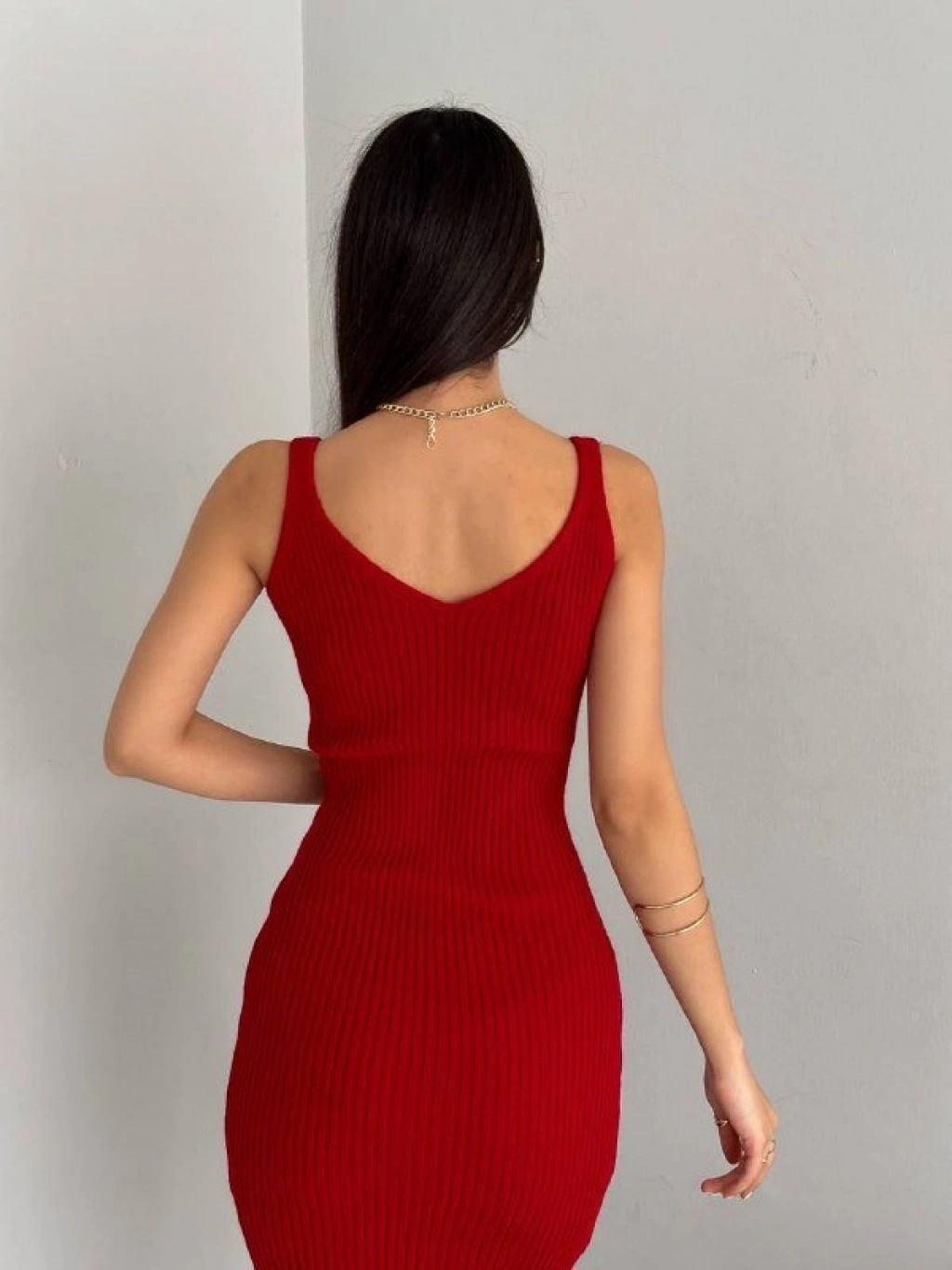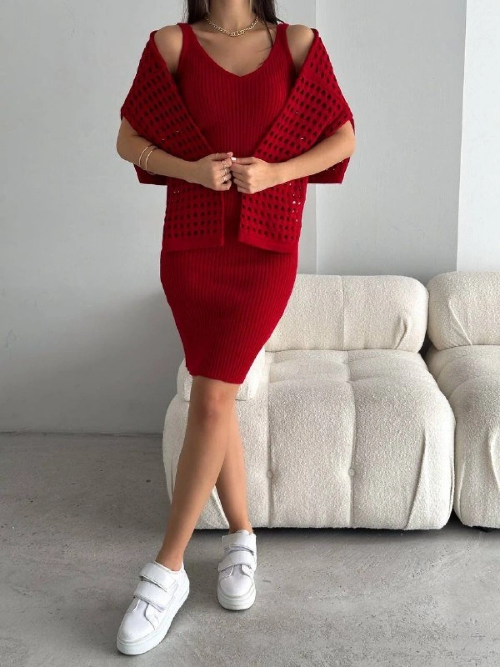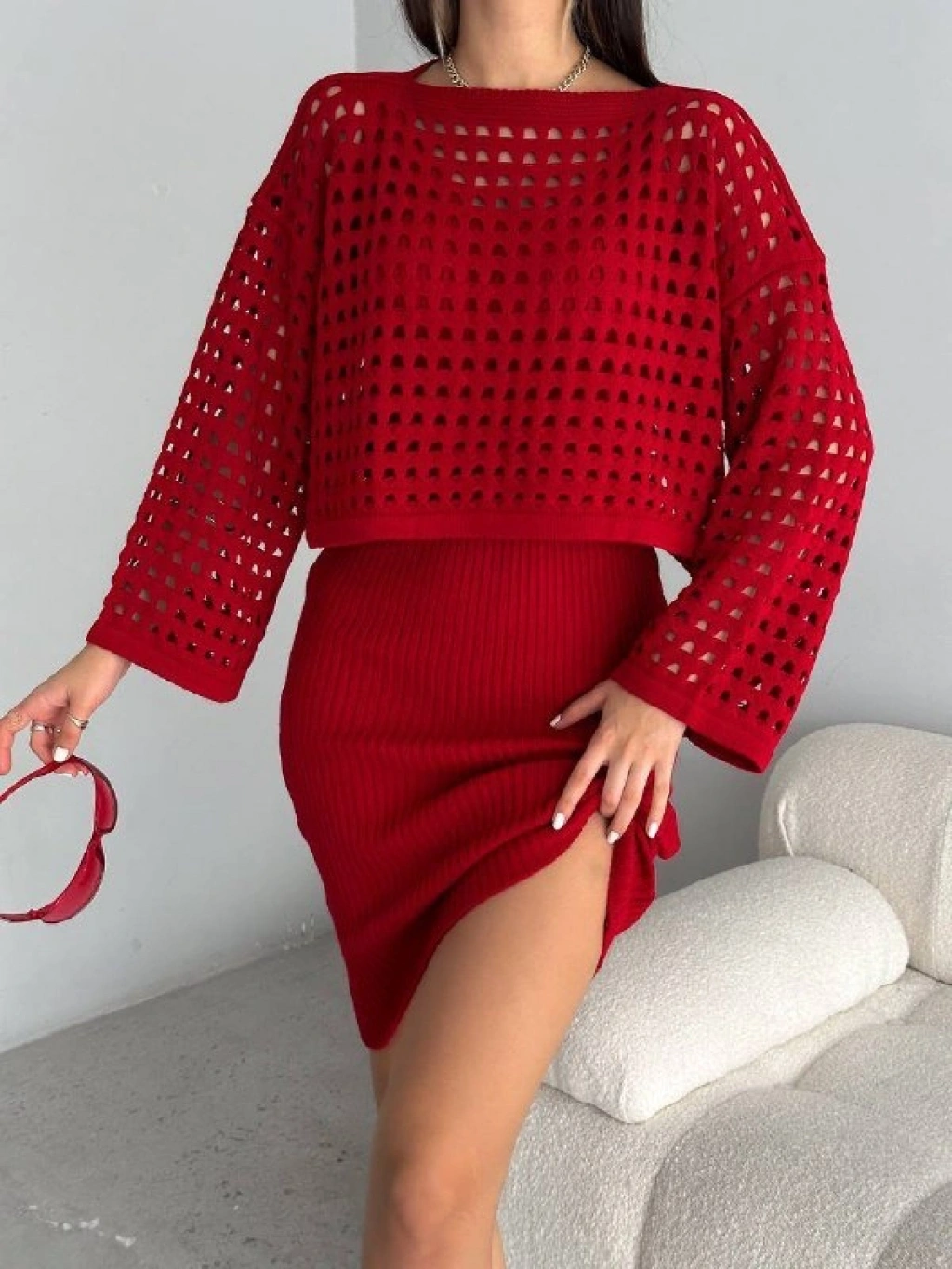 Kadın Delikli Kazak Askılı Elbise Triko Kumaş Ikili Takım