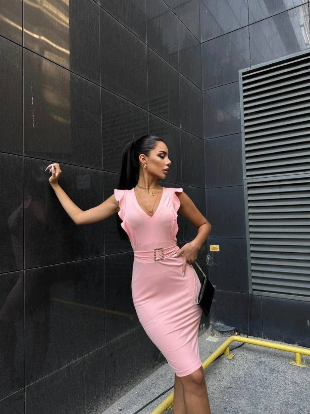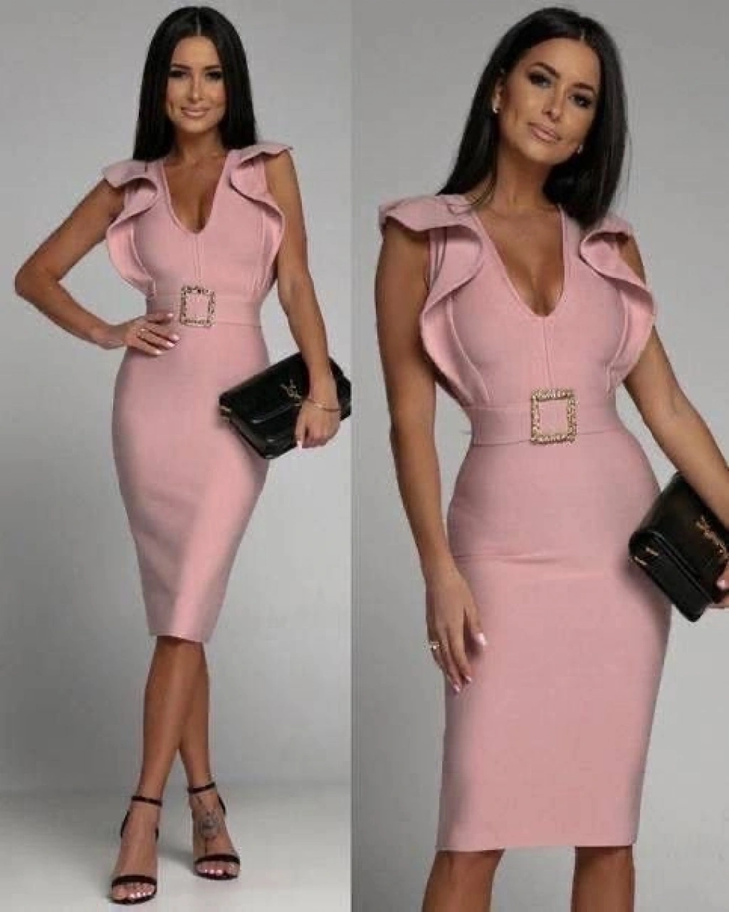 Kadın Derin V Dekolteli Omuzları Volan Detay Fırsat ürün Tokalı Elbise