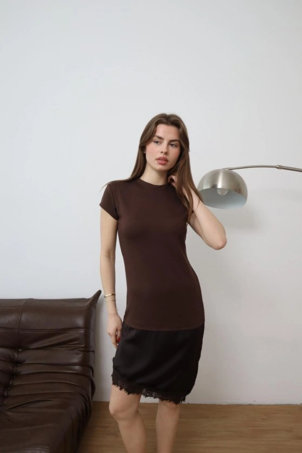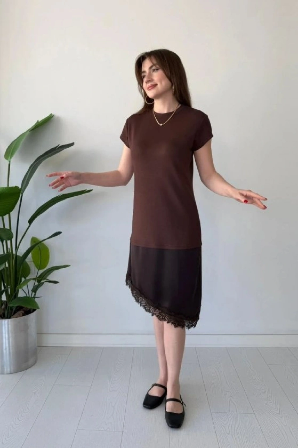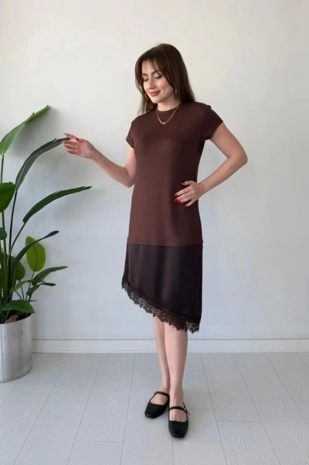 Kadın Etek Ucu Dantel Detaylı Saten Kumaş Elbise