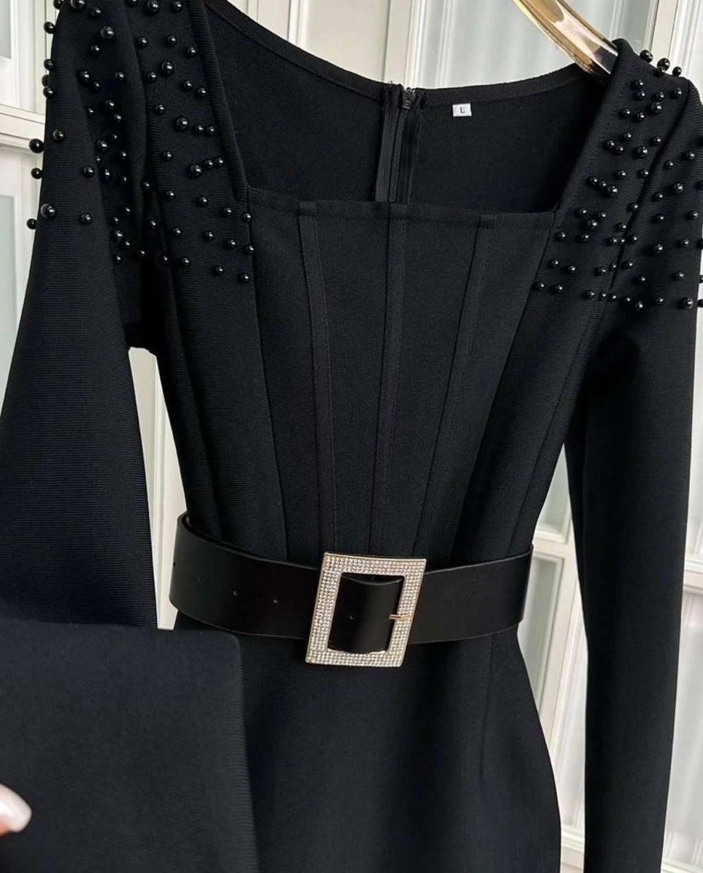 Kadın Etek Ucu Otriş Yakası Inci Detayli Midi Boy Elbise