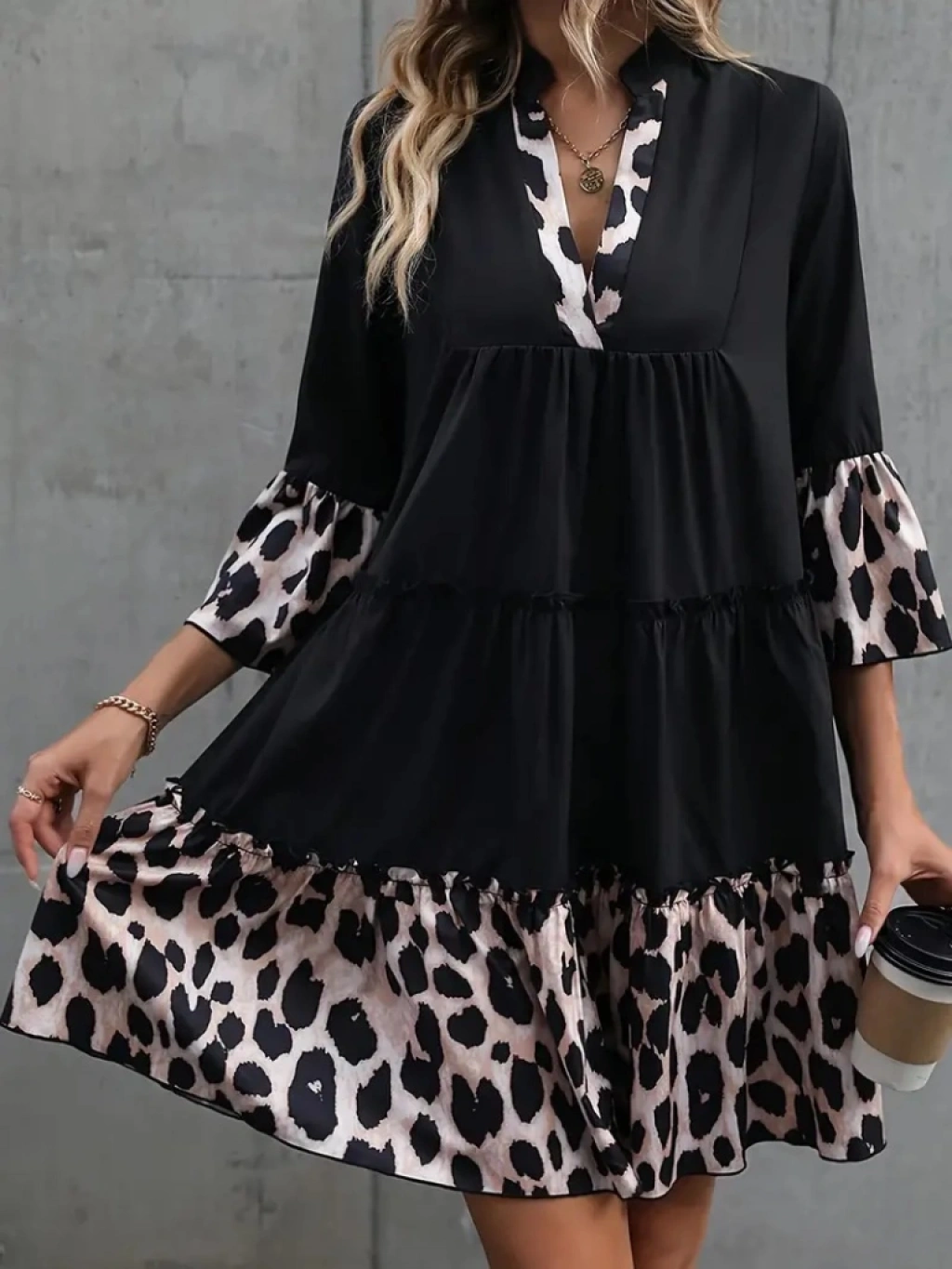 Kadın Fakir Kol V Yakalı Leopar Desen Detaylı Trikoton Elbise