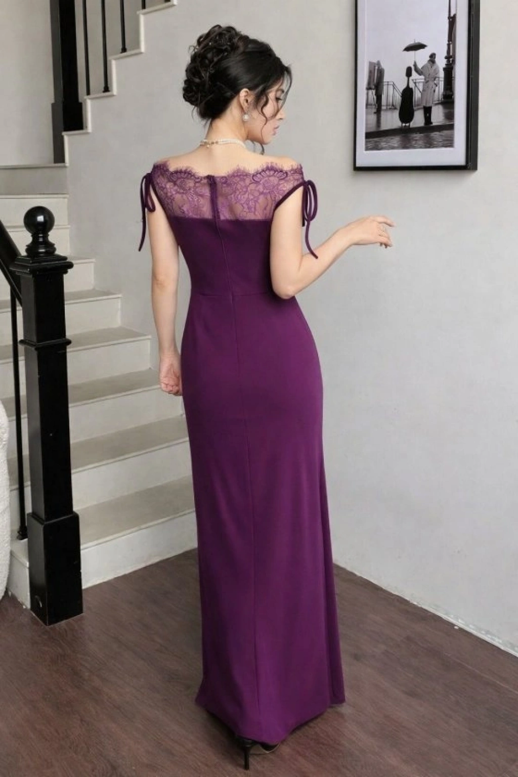 Kadın Göğüs Ve Yakası Dantel Detaylı Kayık Yaka Görünümlü Uzun Ithal Krep Elbise
