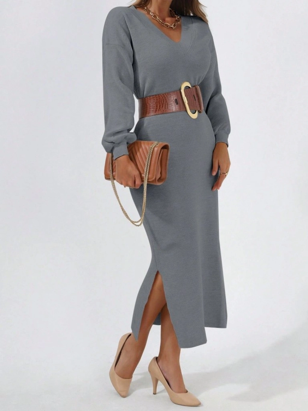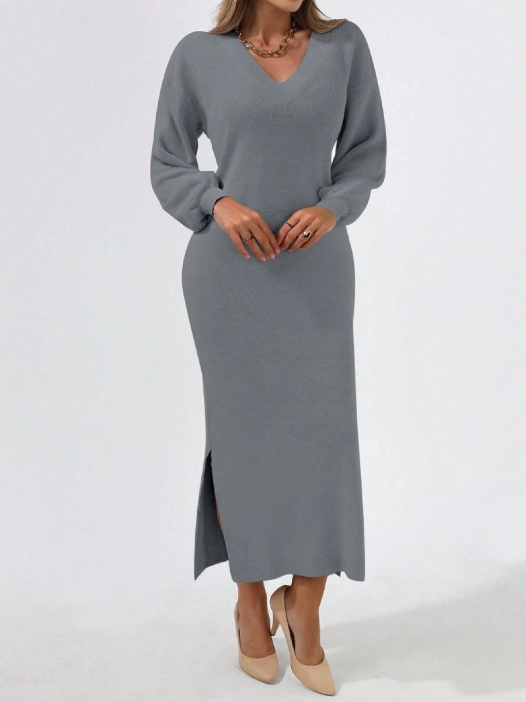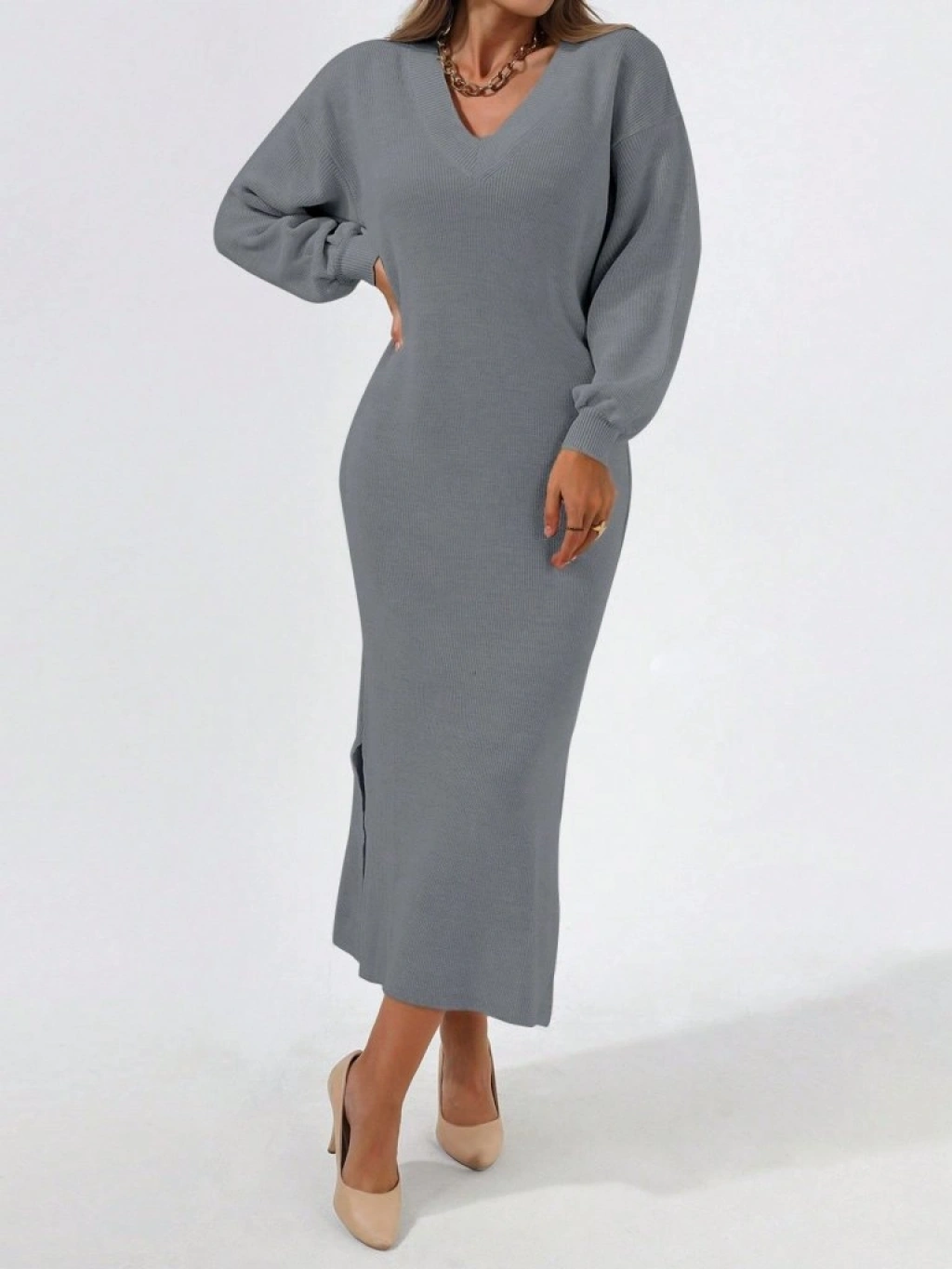Kadın Gri Uzun Kollu Yırtmaçlı V Yaka Triko Elbise
