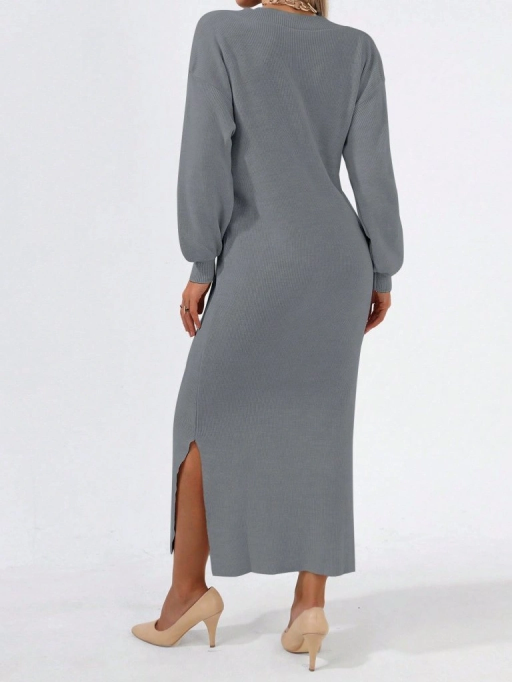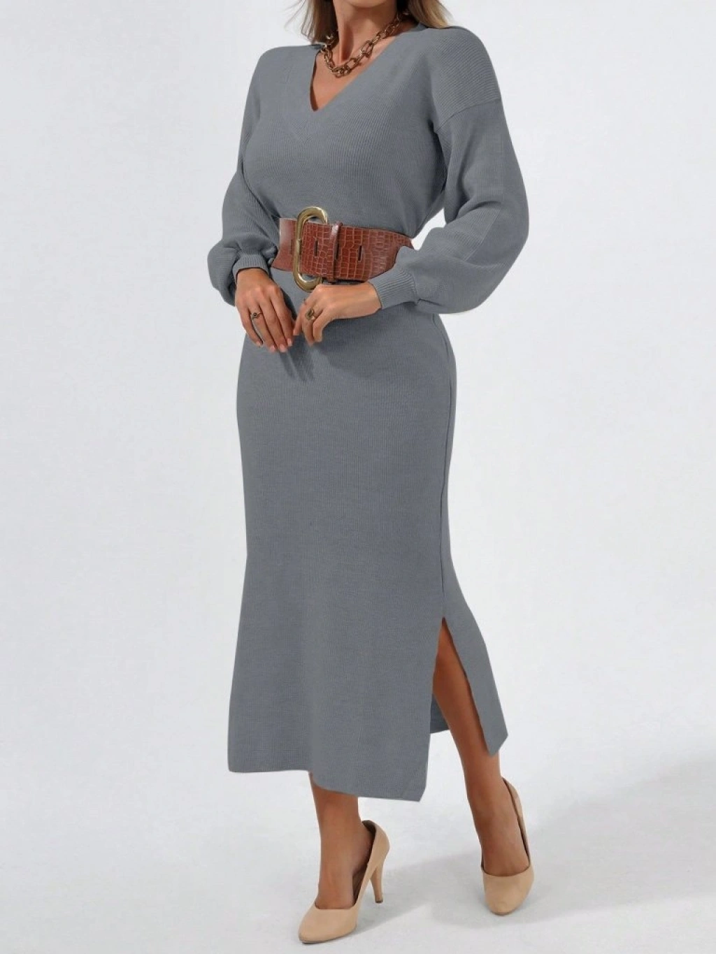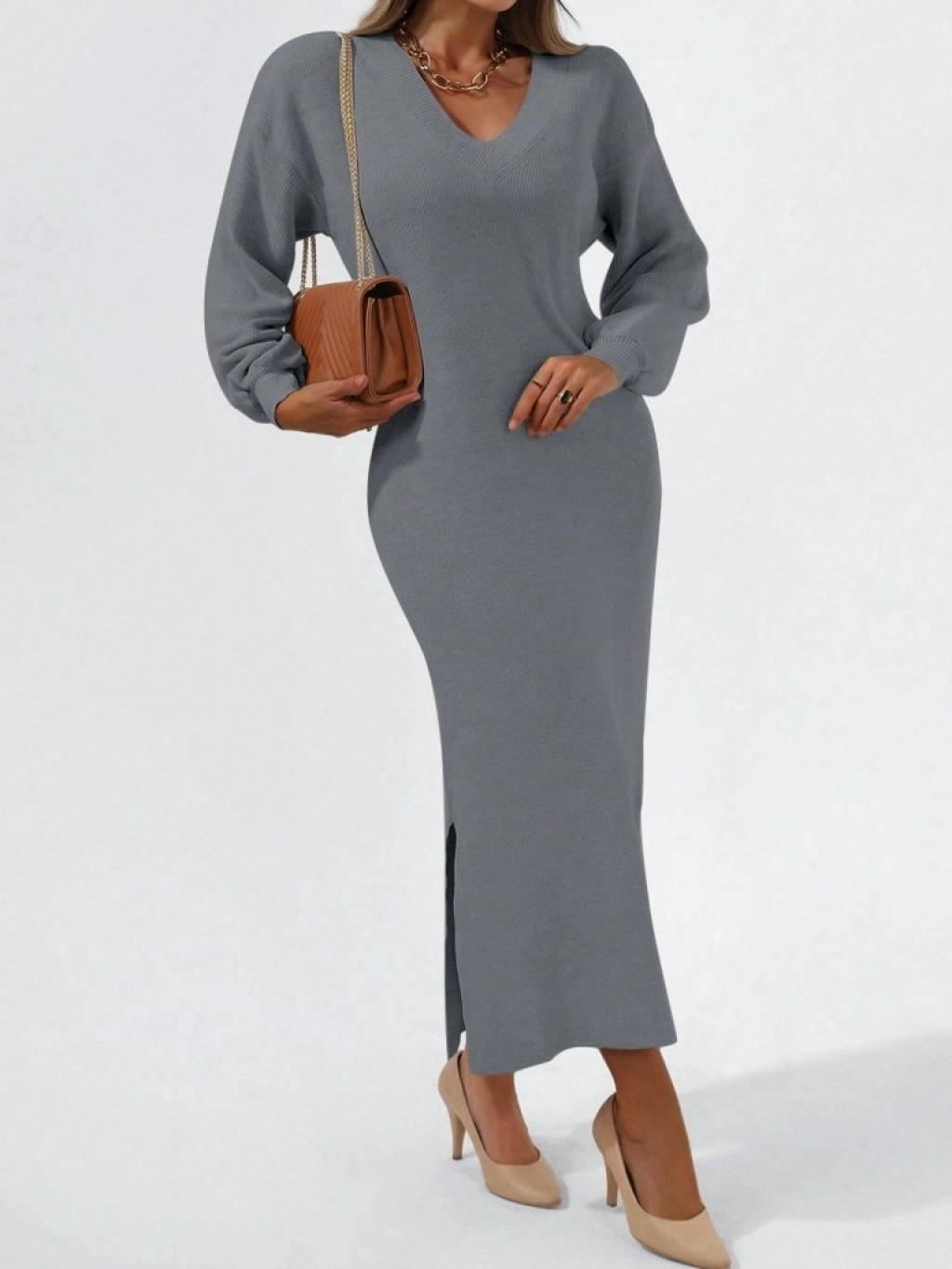 Kadın Gri Uzun Kollu Yırtmaçlı V Yaka Triko Elbise