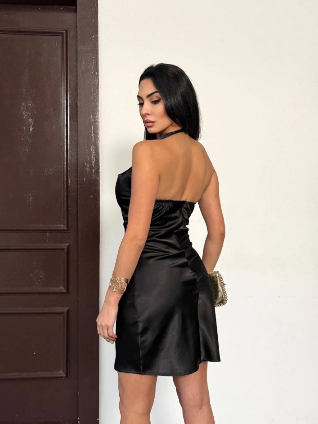 Kadın Halter Yaka Sırt Dekolteli Mini Saten Elbise