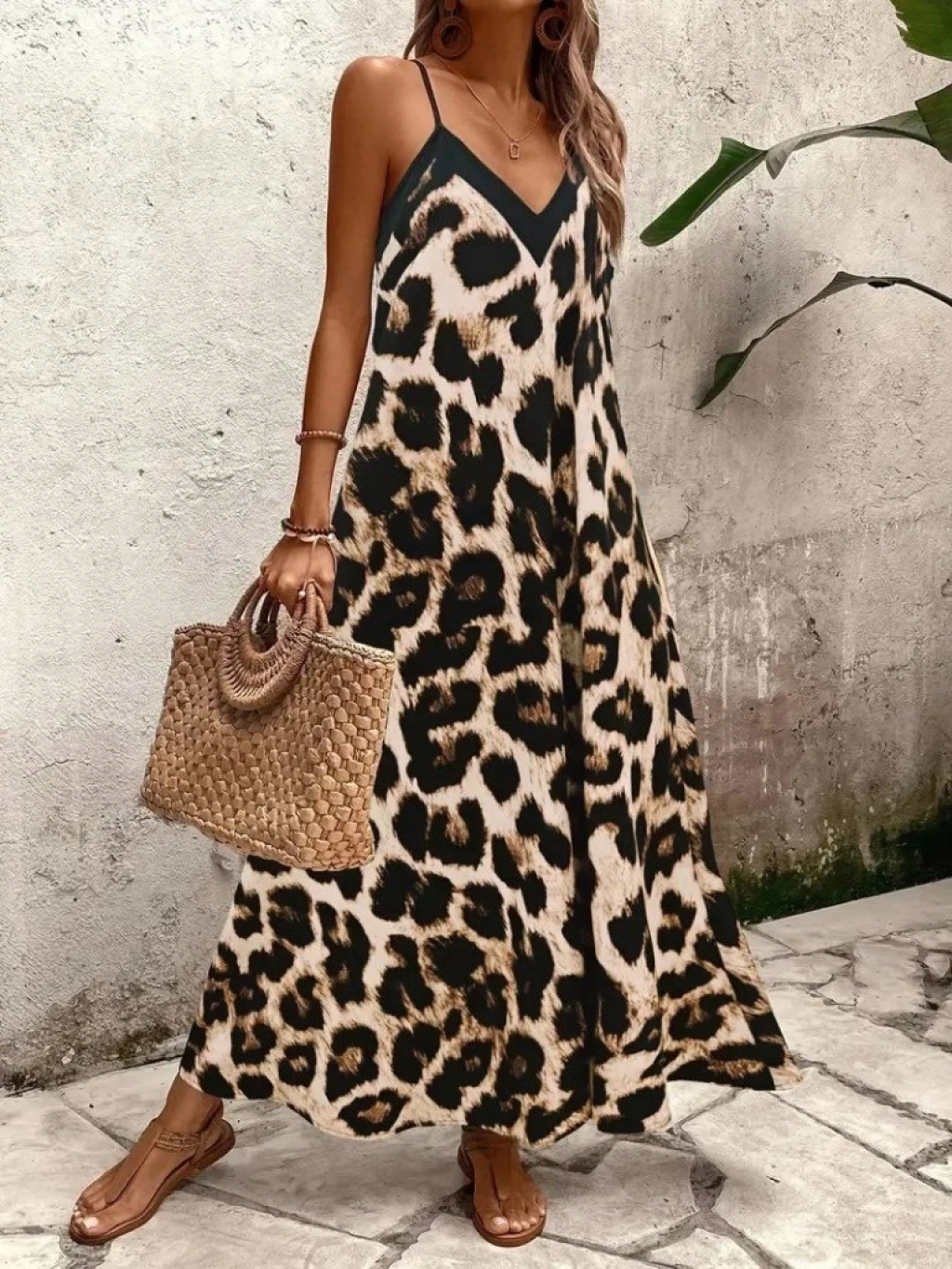 Kadın Ip Askılı Geniş V Yakalı Leopar Desenli Süprem Elbise