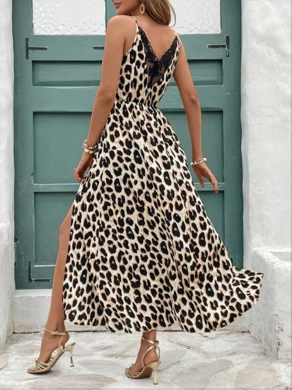 Kadın Ip Askılı Yuvarlak Yakalı Arkası V Yakalı Yırtmaçlı Uzun Leopar Desenli Süprem Elbise