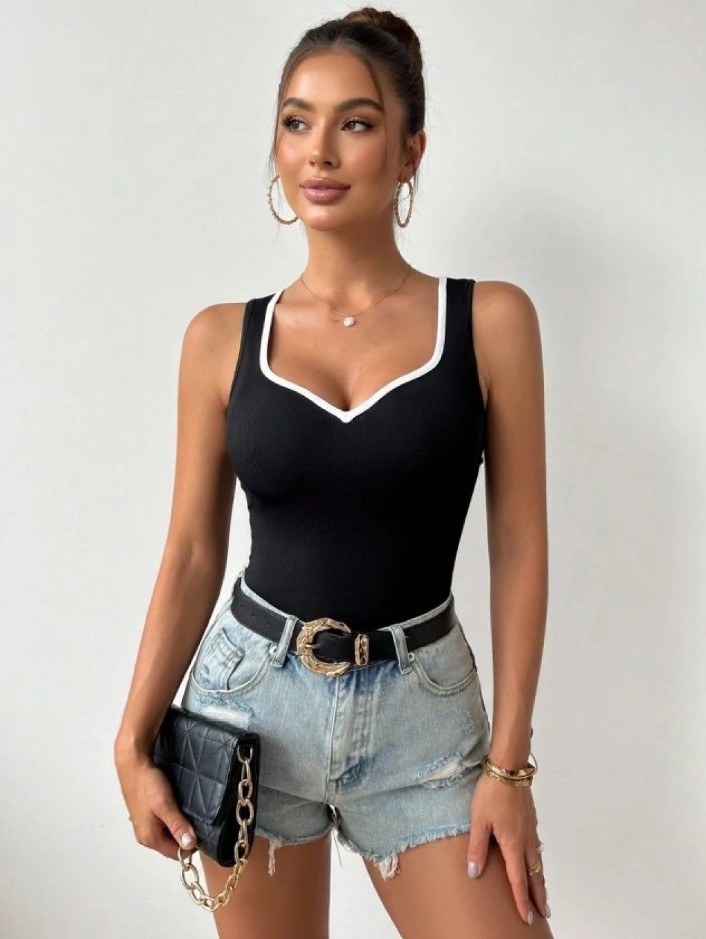 Kadın Siyah Kalp Yaka Beyaz Biyeli Kaşkorse Bluz Atlet