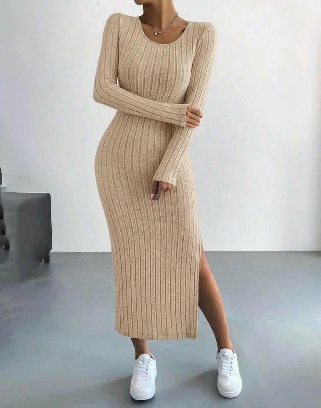 Kadın Kaşkorse Kumaş Yırtmaç Detaylı Uzun Kollu Elbise