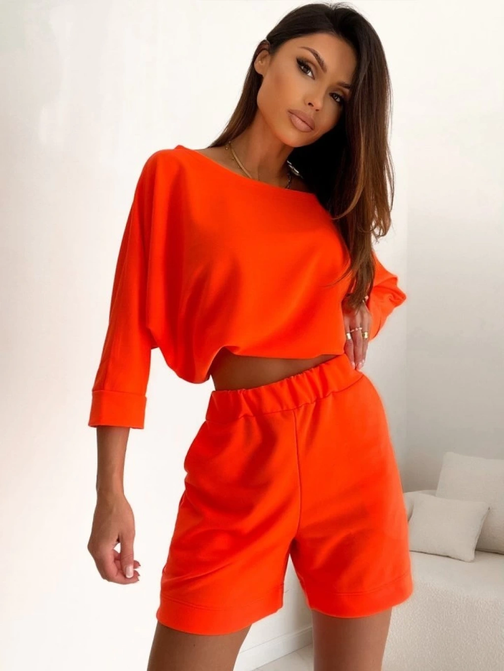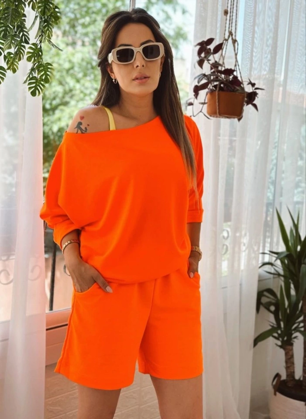 Kadın Kayık Yaka Oversize Asimetrik Bluz Ve şort Iki Iplik Takım
