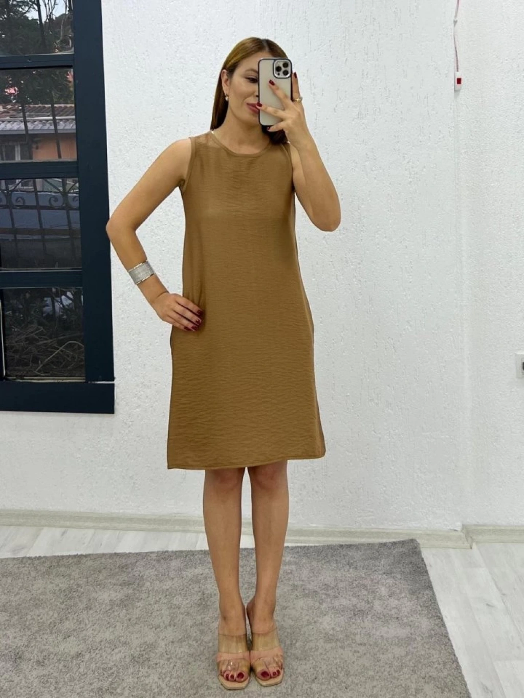 Kadın Keten Kumaş Cep Detaylı Sıfır Kol Elbise