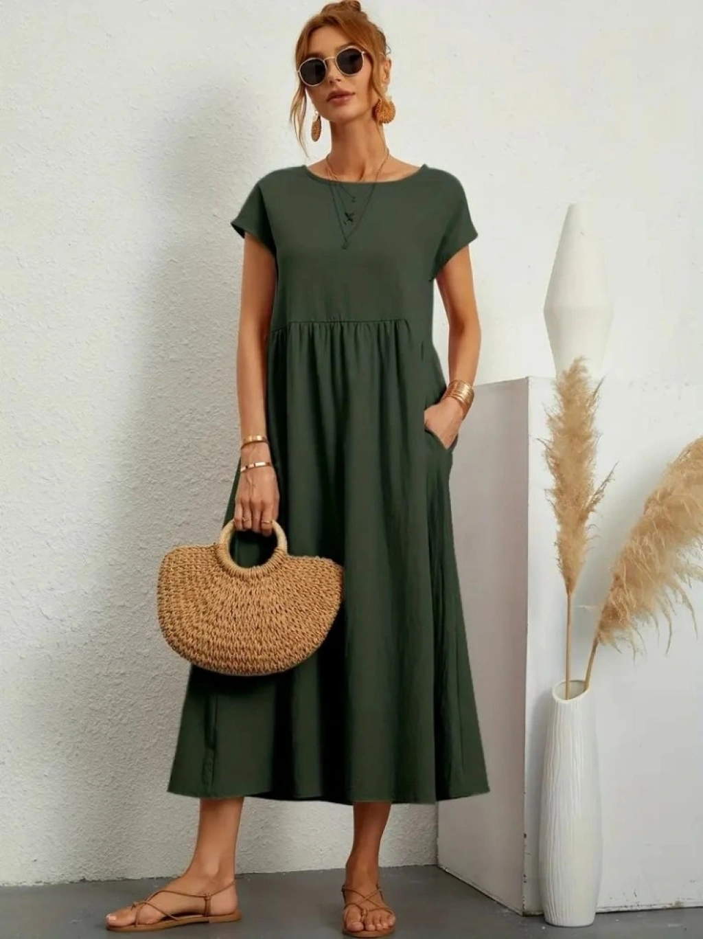Kadın Kısa Kollu Bel Büzgü Detay Bürümcük Midi Boy Salaş Elbise