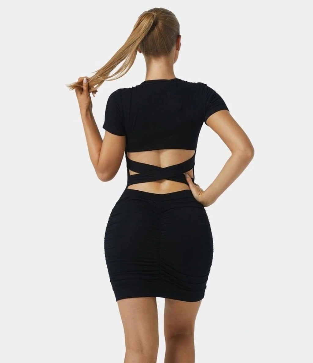 Kadın Kısa Kollu Bel çapraz şerit Detay Büzgülü Sandy Kumaş Elbise