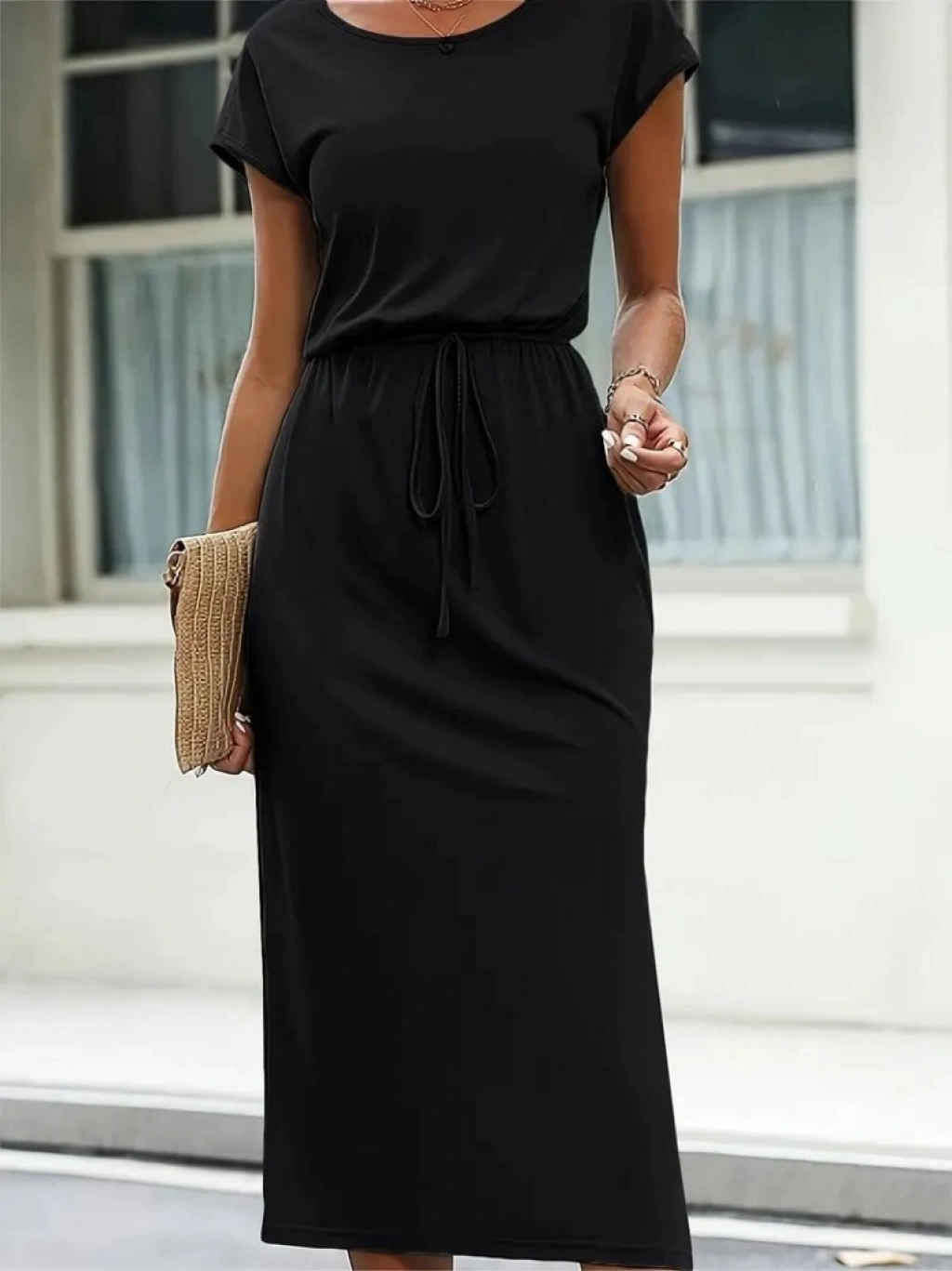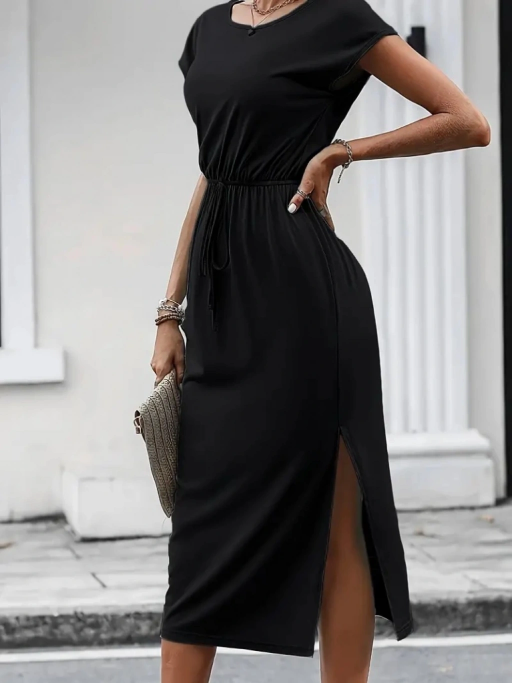 Kadın Kısa Kollu Bisiklet Yaka Belden Kuşaklı Yandan Yırtmaçlı Maksi Elbise