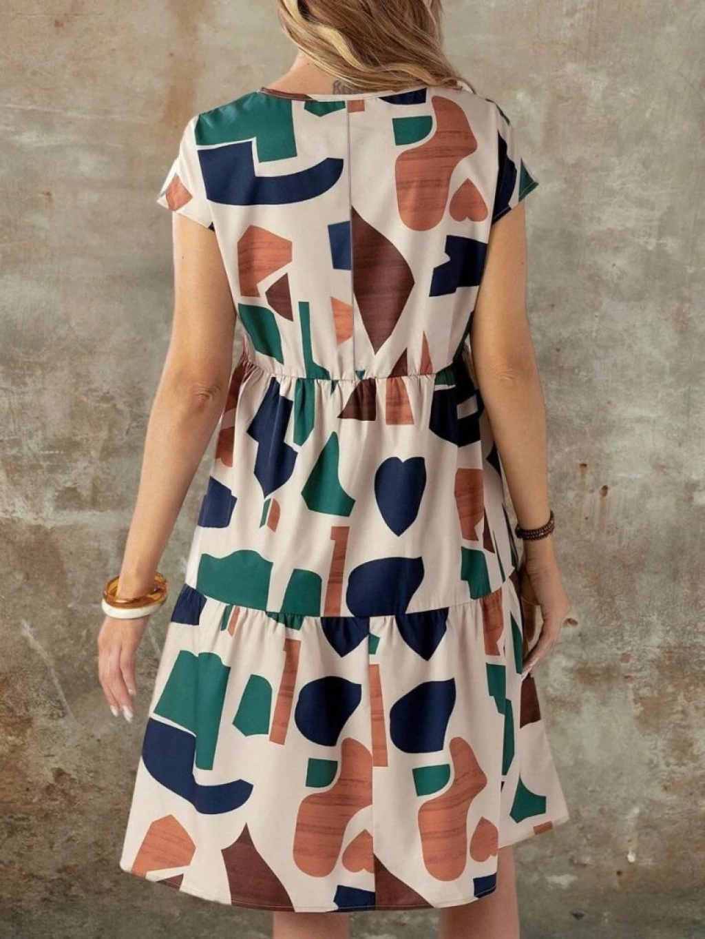 Kadın Kısa Kollu Bisiklet Yaka Desenli Fırfırlı Süprem Elbise