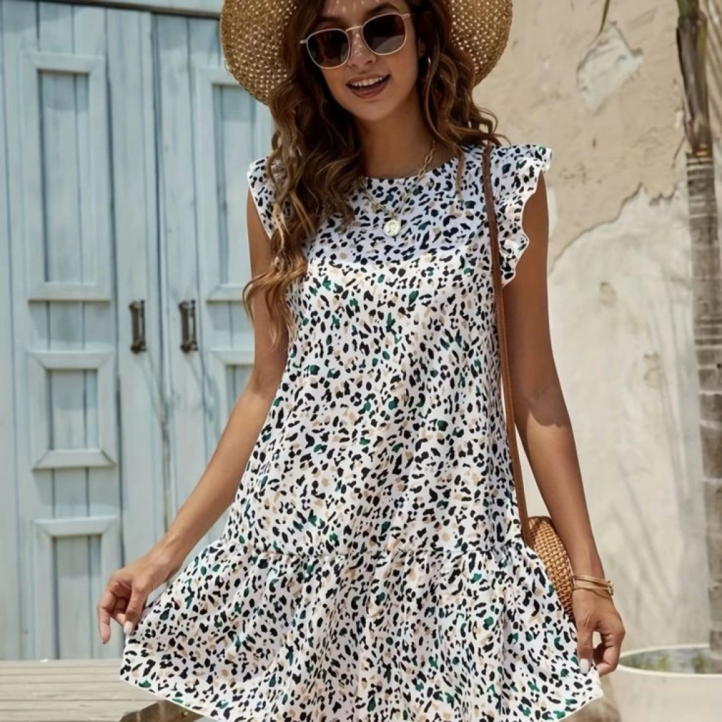 Kadın Kısa Kollu Bisiklet Yaka Etek Ucu Volanlı Kısa Dokuma Elbise