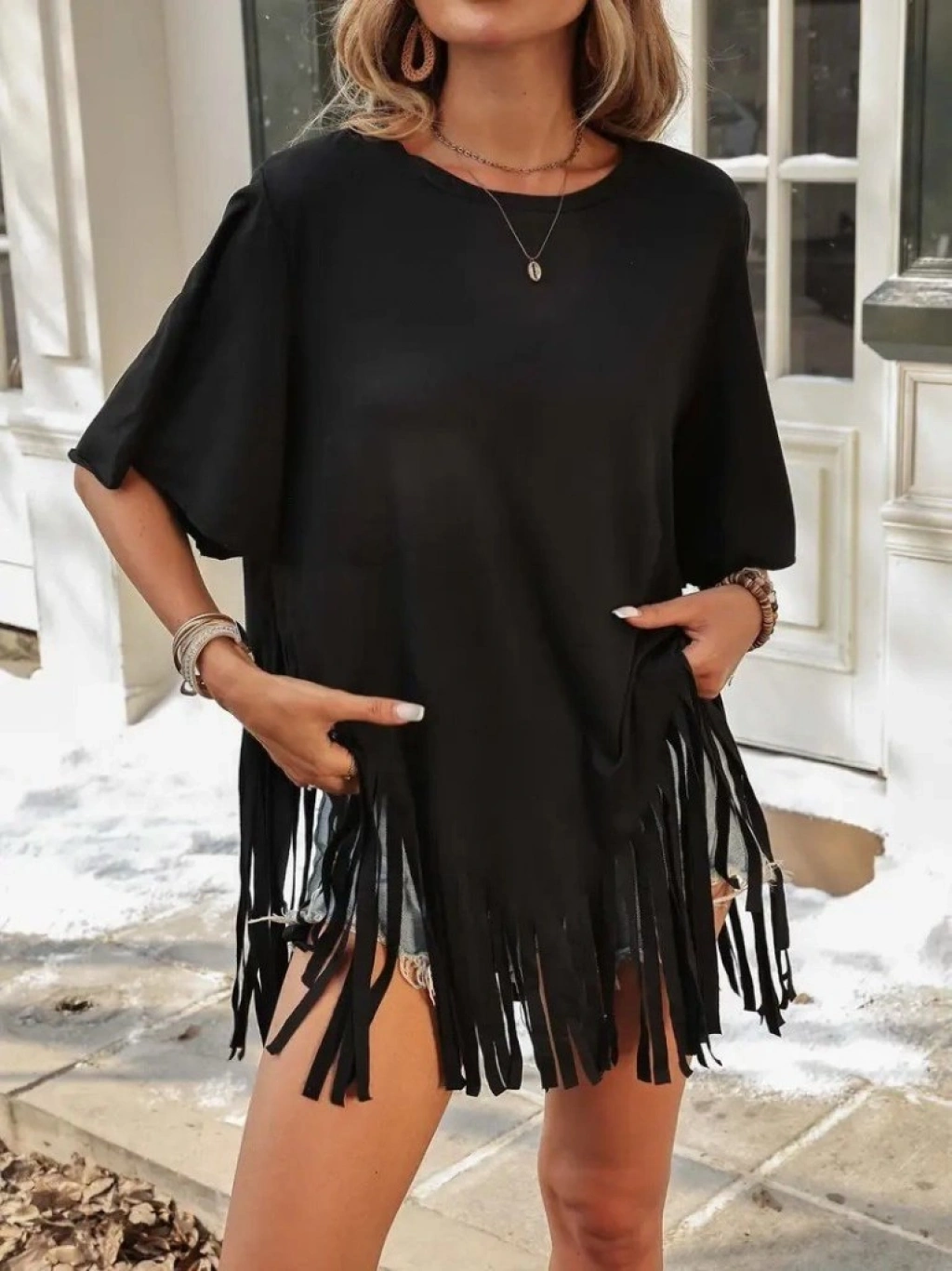 Kadın Kısa Kollu Bisiklet Yaka Püsküllü Viskon Bluz