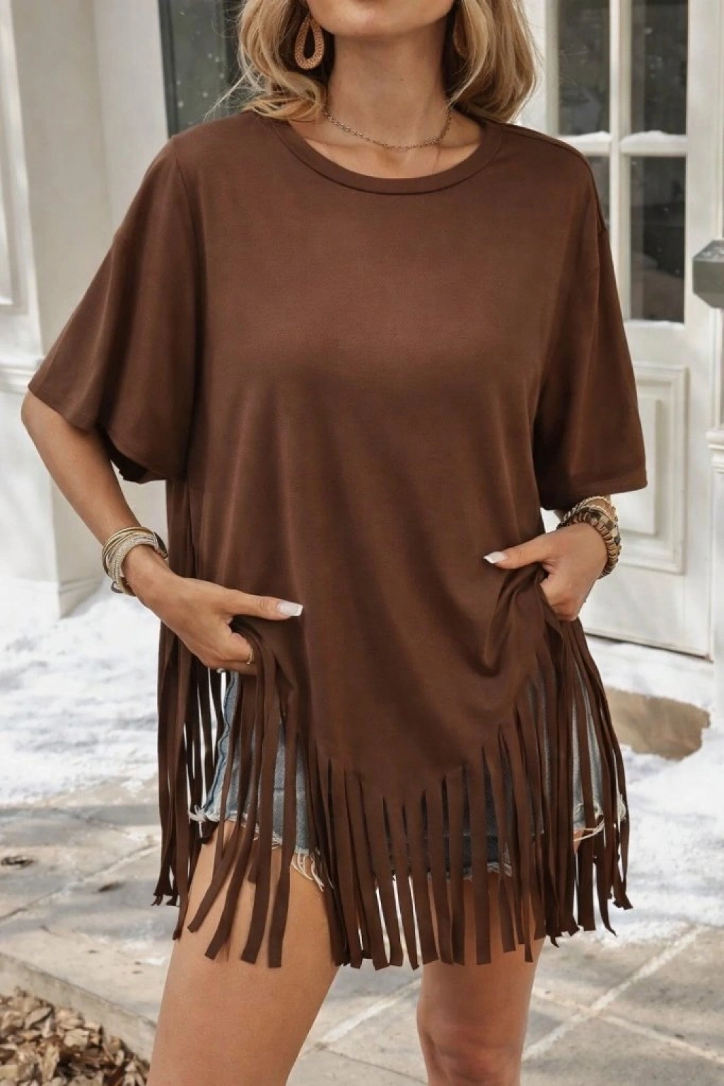 Kadın Kısa Kollu Bisiklet Yaka Püsküllü Viskon Bluz