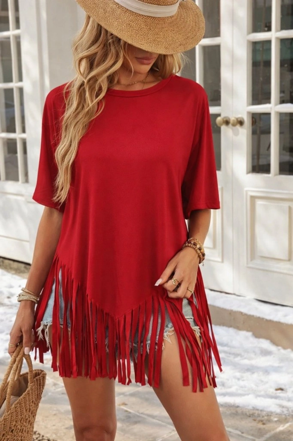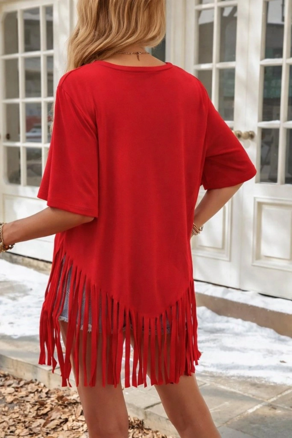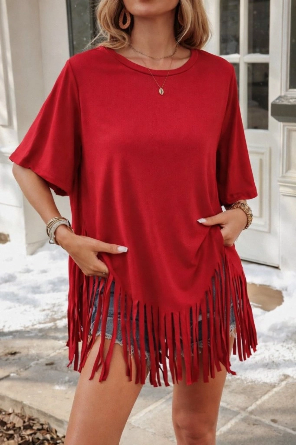 Kadın Kısa Kollu Bisiklet Yaka Püsküllü Viskon Bluz