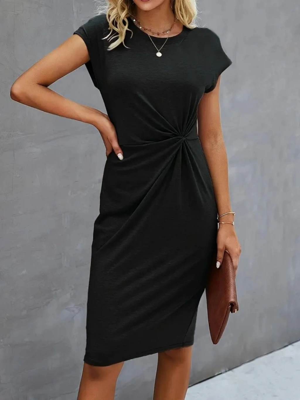 Kadın Kısa Kollu Bisiklet Yaka Yandan Büzgülü Midi Viskon Elbise