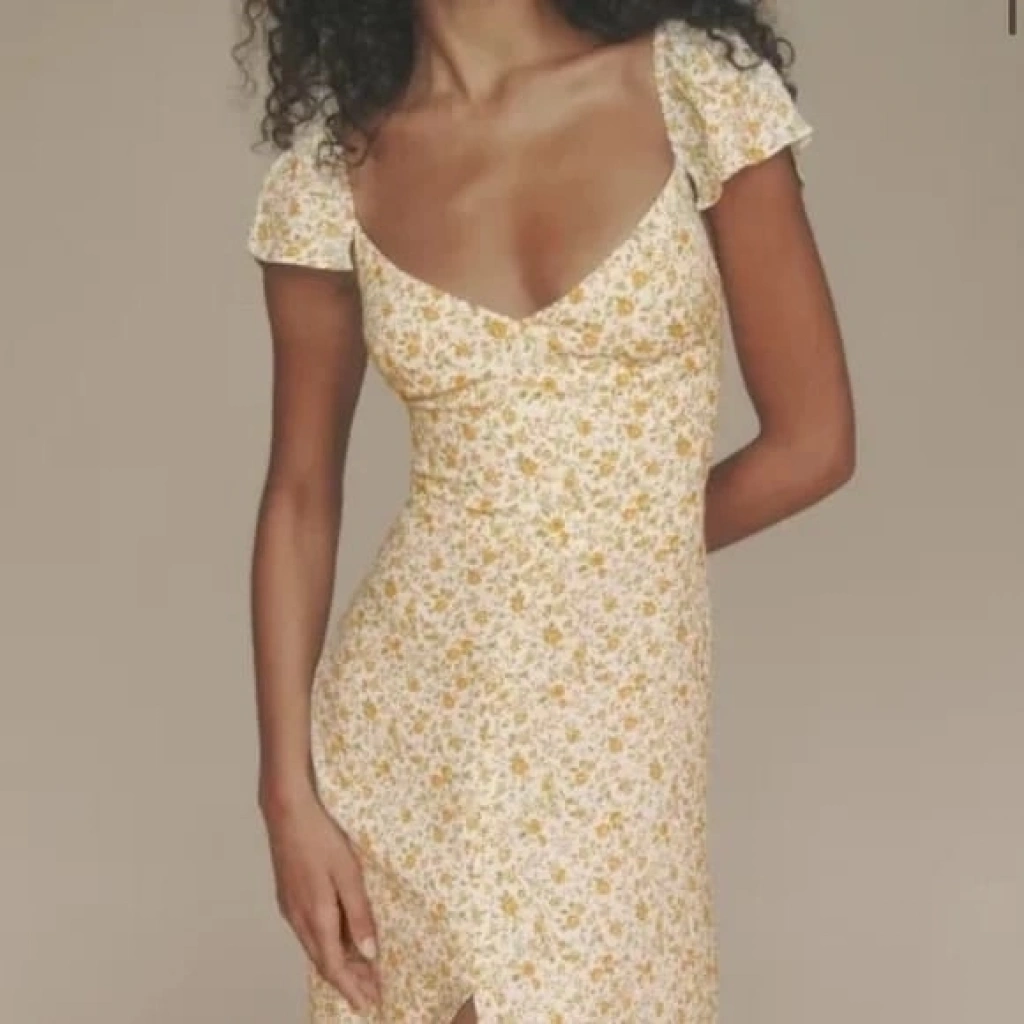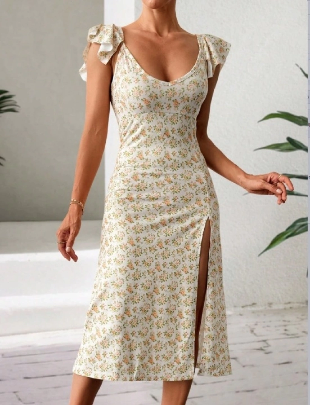 Kadın Kısa Kollu çiçek Desen Yırtmaçlı Süprem Elbise