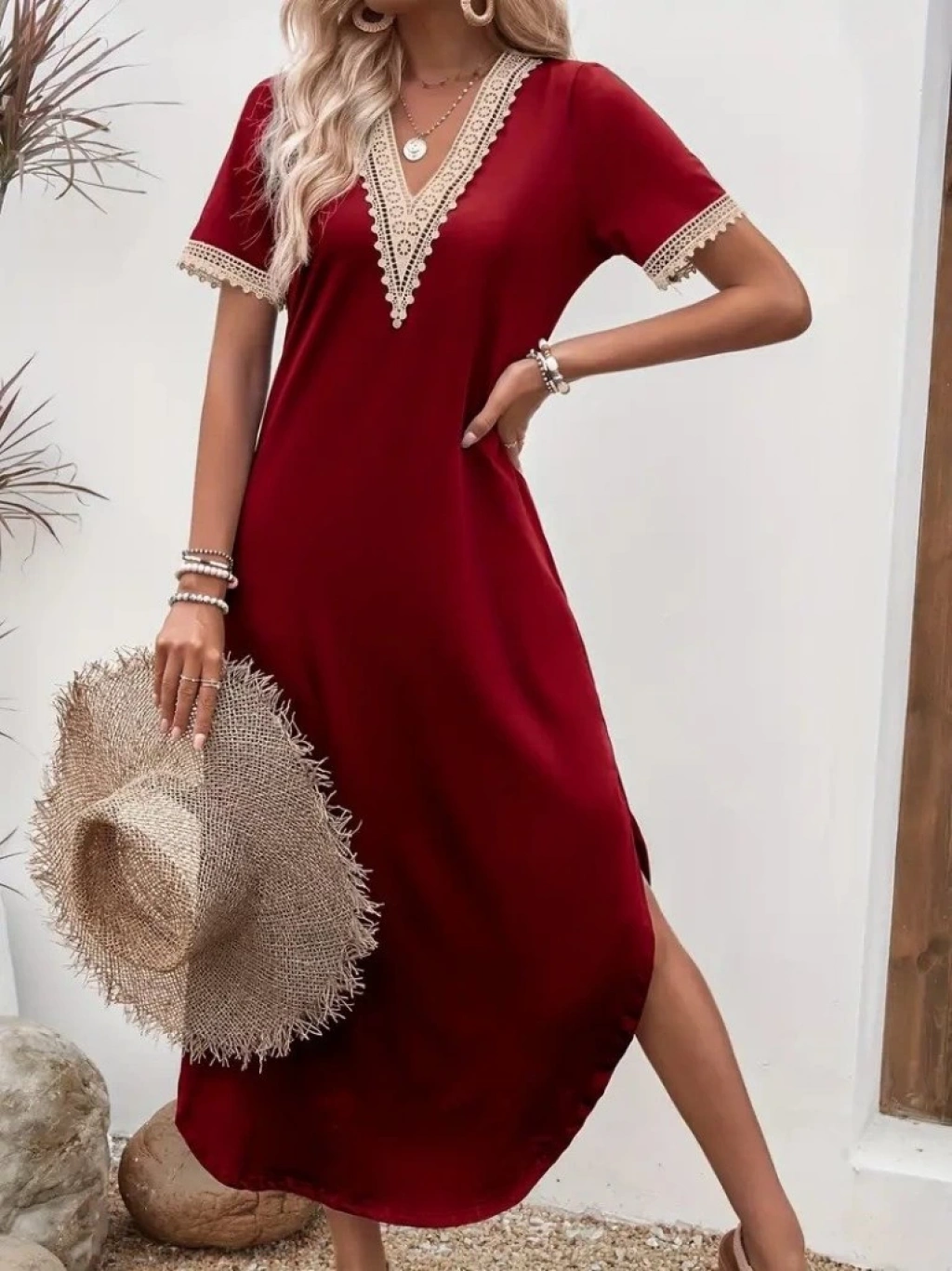 Kadın Kısa Kollu Dantel V Yakalı Uzun Viskon Elbise