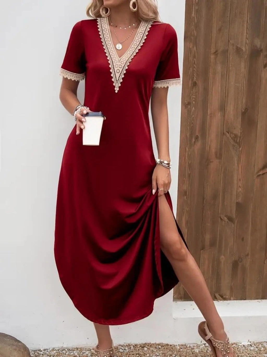 Kadın Kısa Kollu Dantel V Yakalı Uzun Viskon Elbise