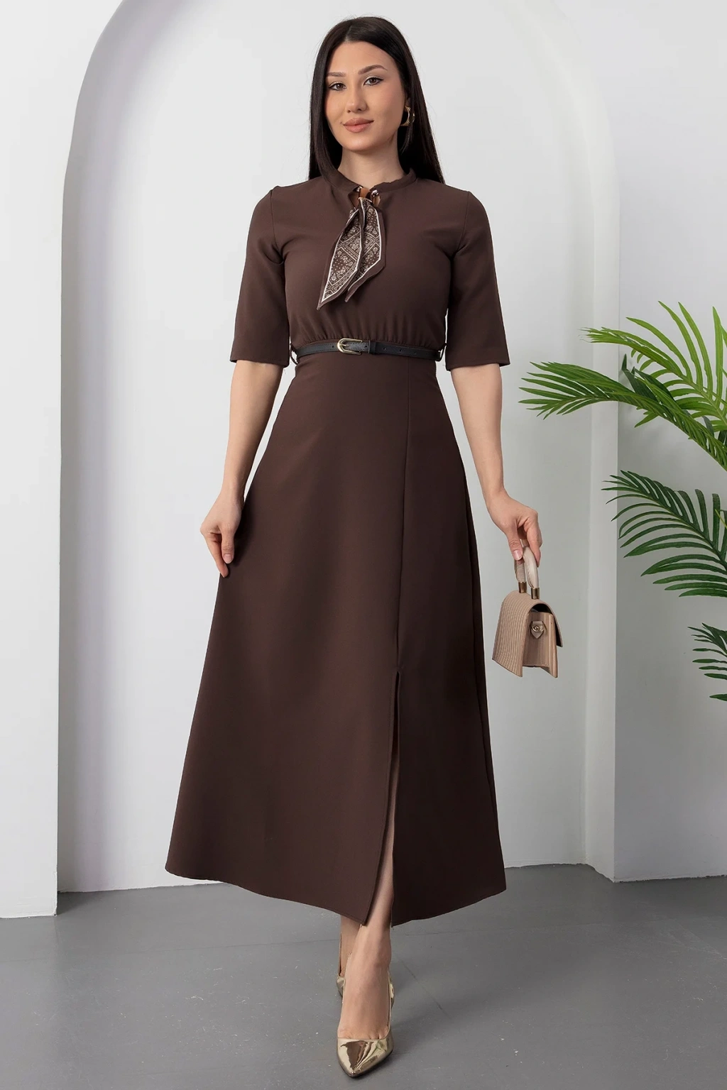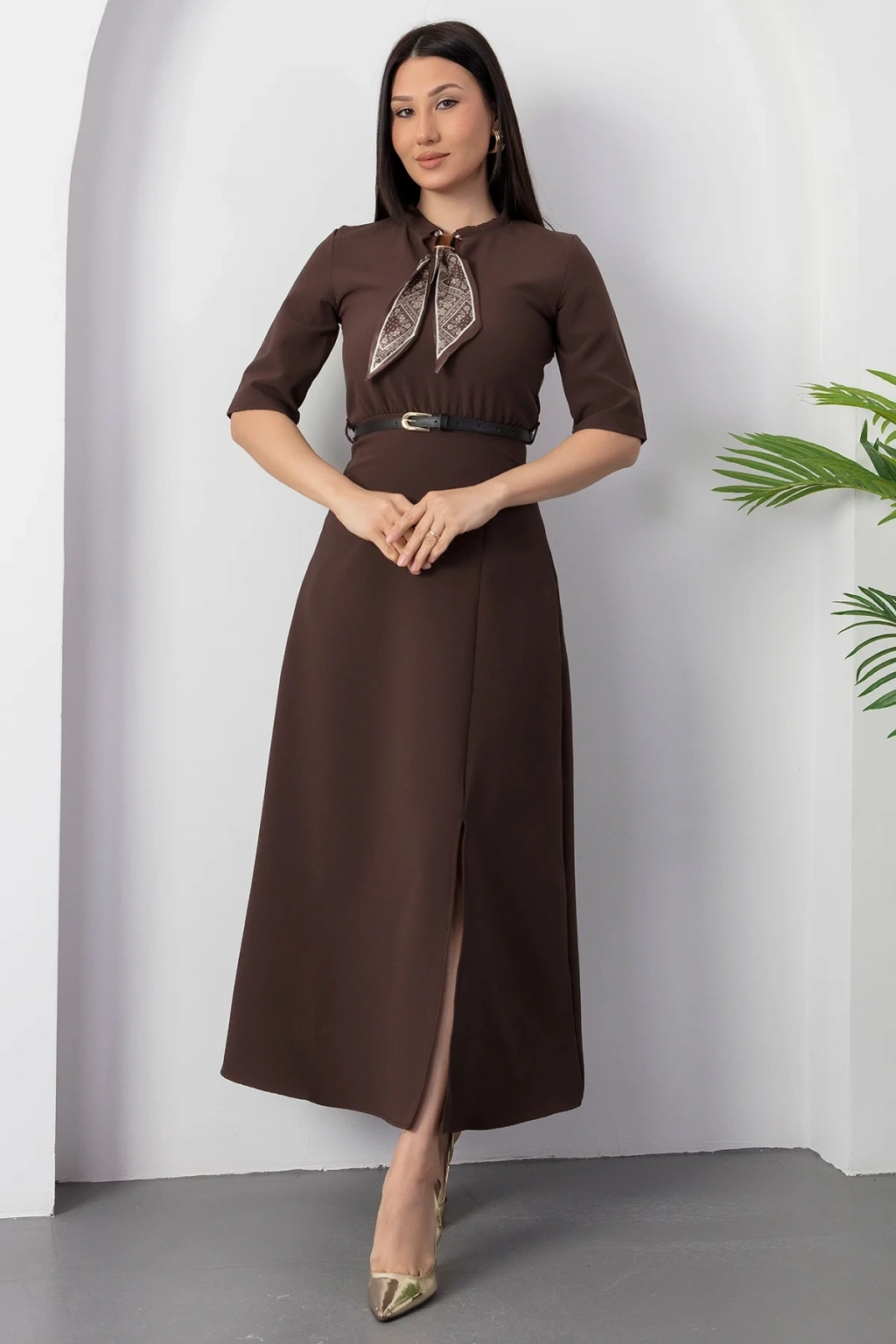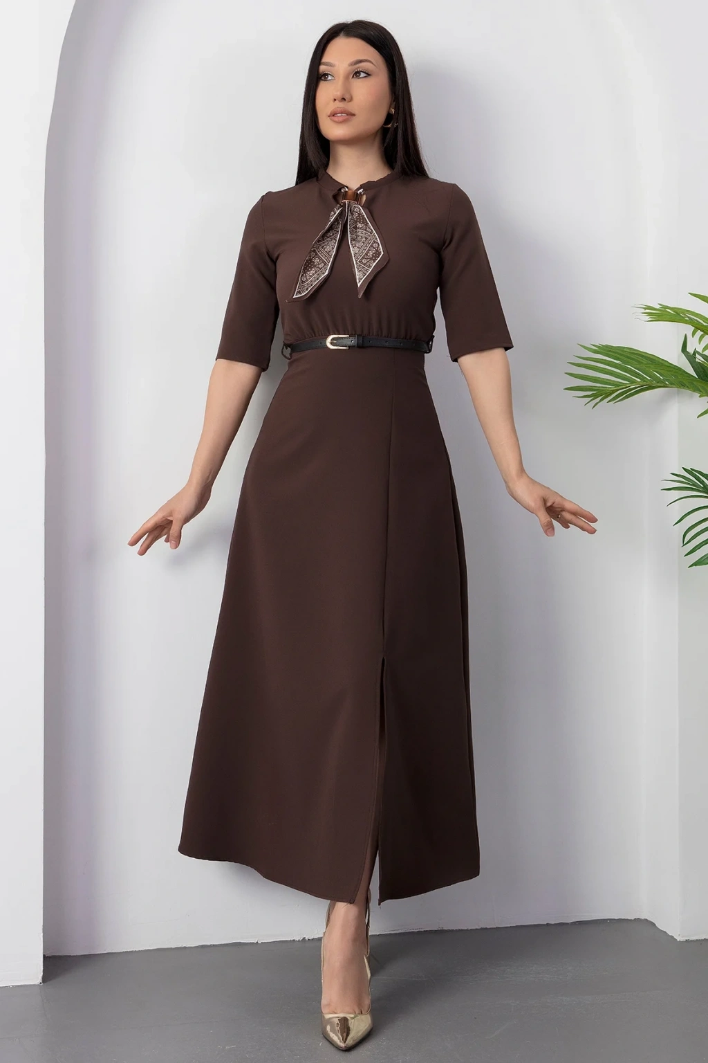 Kadın Kısa Kollu Fular Ve Kemer Detay önden Yırtmaçlı Maxi Boy Elbise