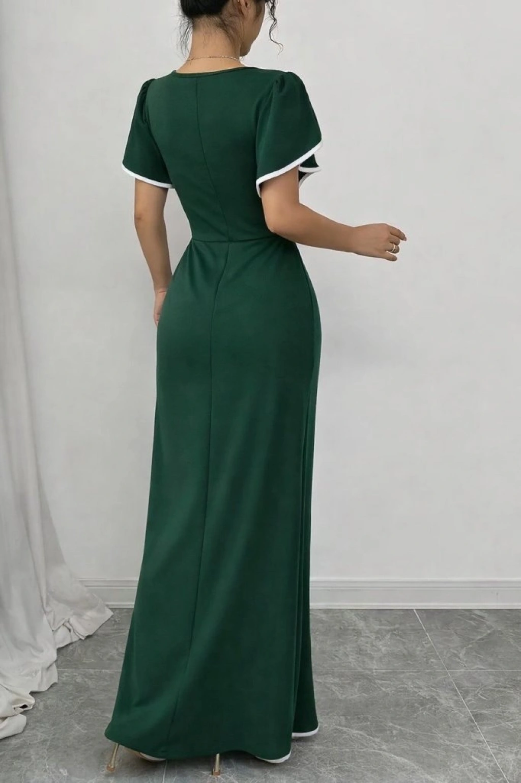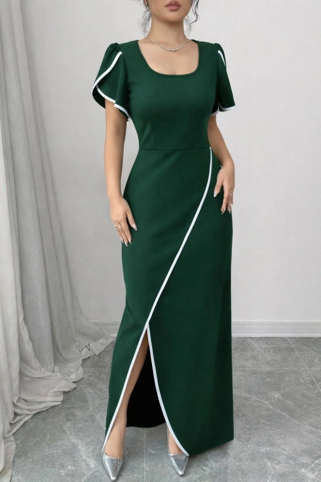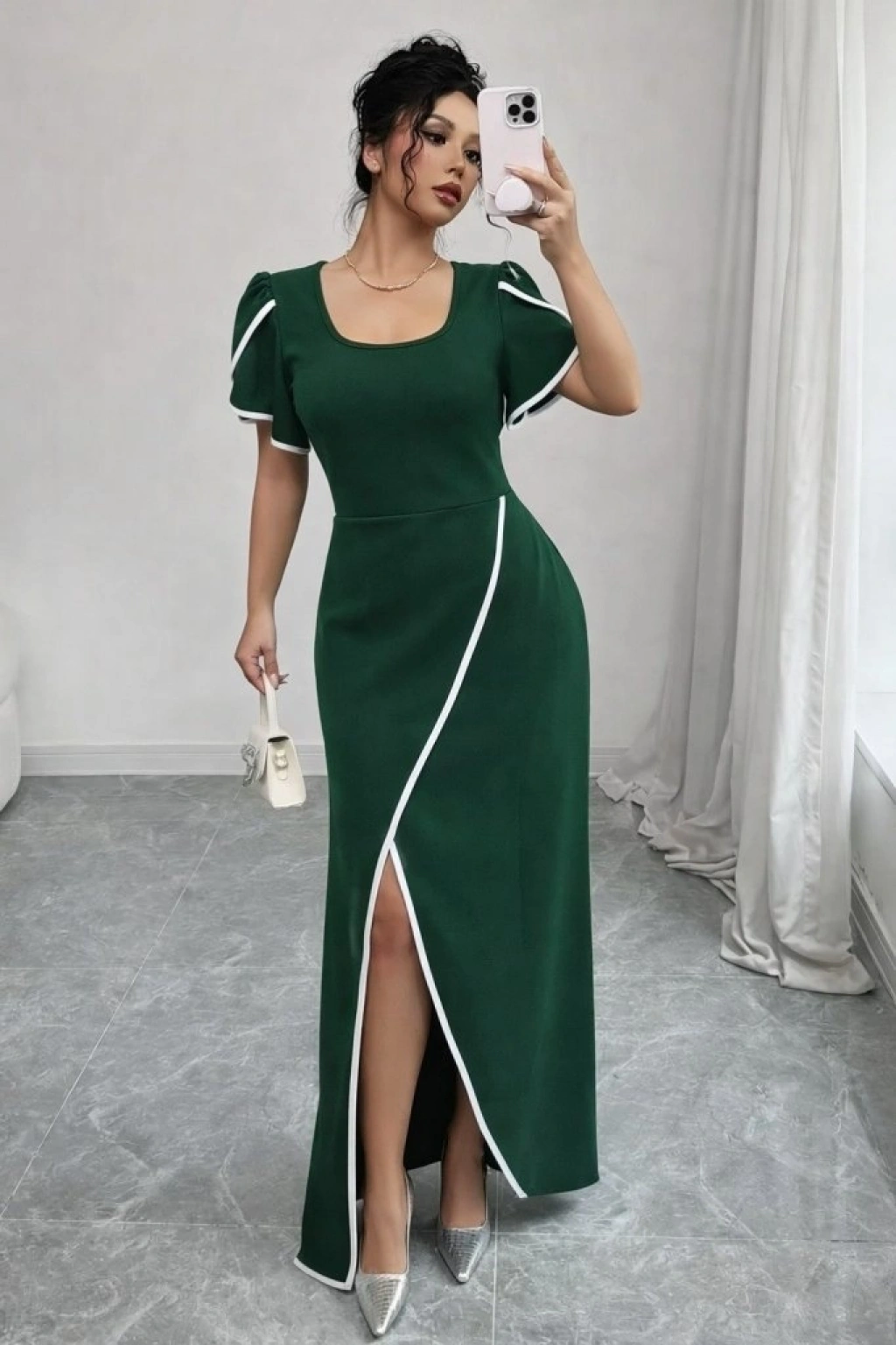 Kadın Kısa Kollu Kare Yakalı önden çapraz Kesim Detaylı Krep Elbise