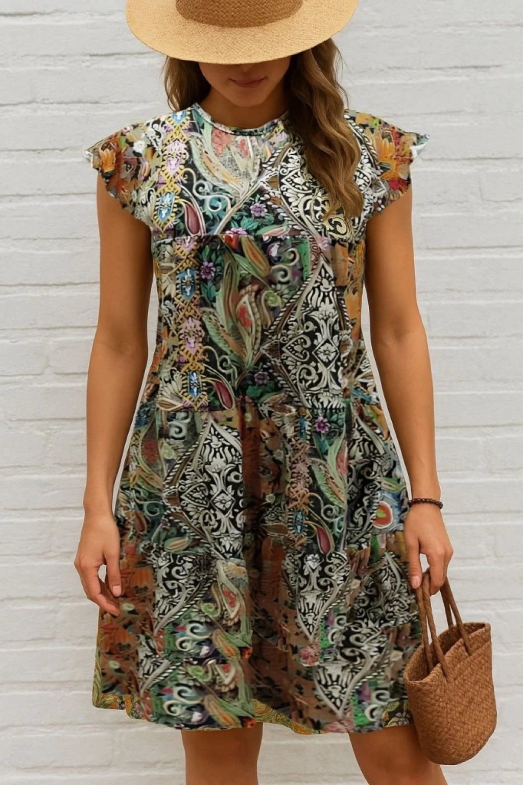 Kadın Kısa Kollu Kolları Fırfırlı Bisiklet Yakalı Kare Desenli Elbise