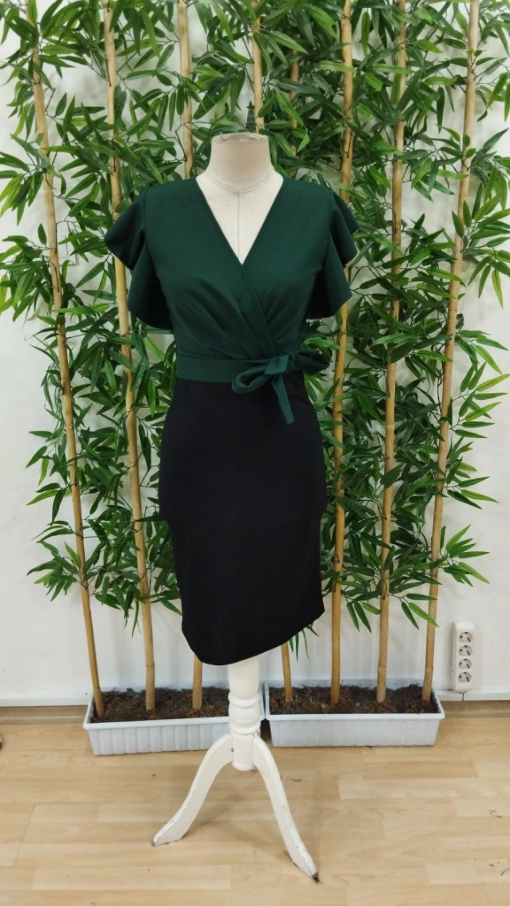 Kadın Kısa Kollu Kruvaze Yaka Beli Kuşaklı Blok Desenli Ithal Krep Elbise